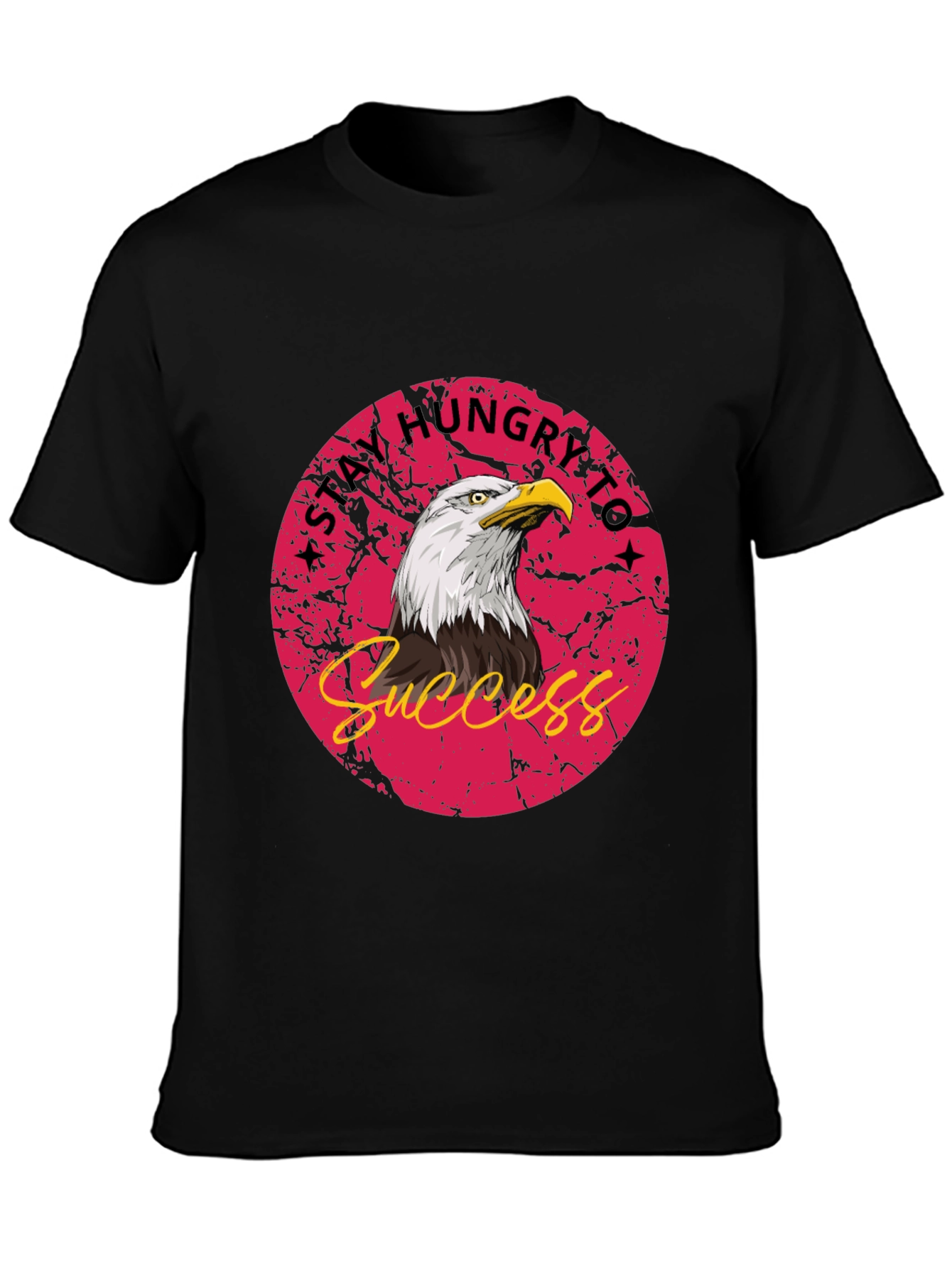Show your ambition with this bold black graphic tee! Featuring a striking eagle head within a distressed red circle, it reads 'Stay Hungry To Success' in eye-catching yellow script. The design makes a statement. Made from comfortable fabric, it's perfect for casual wear or a motivational gym session. Inspire yourself and others with this unique and powerful design!