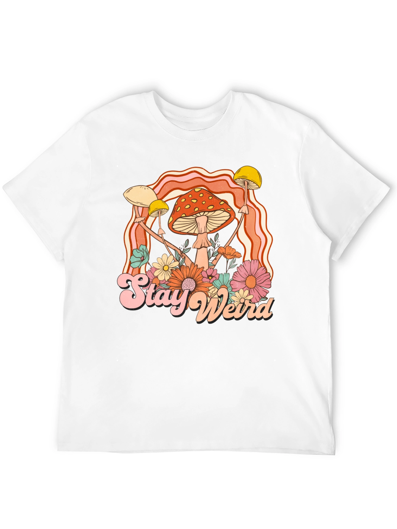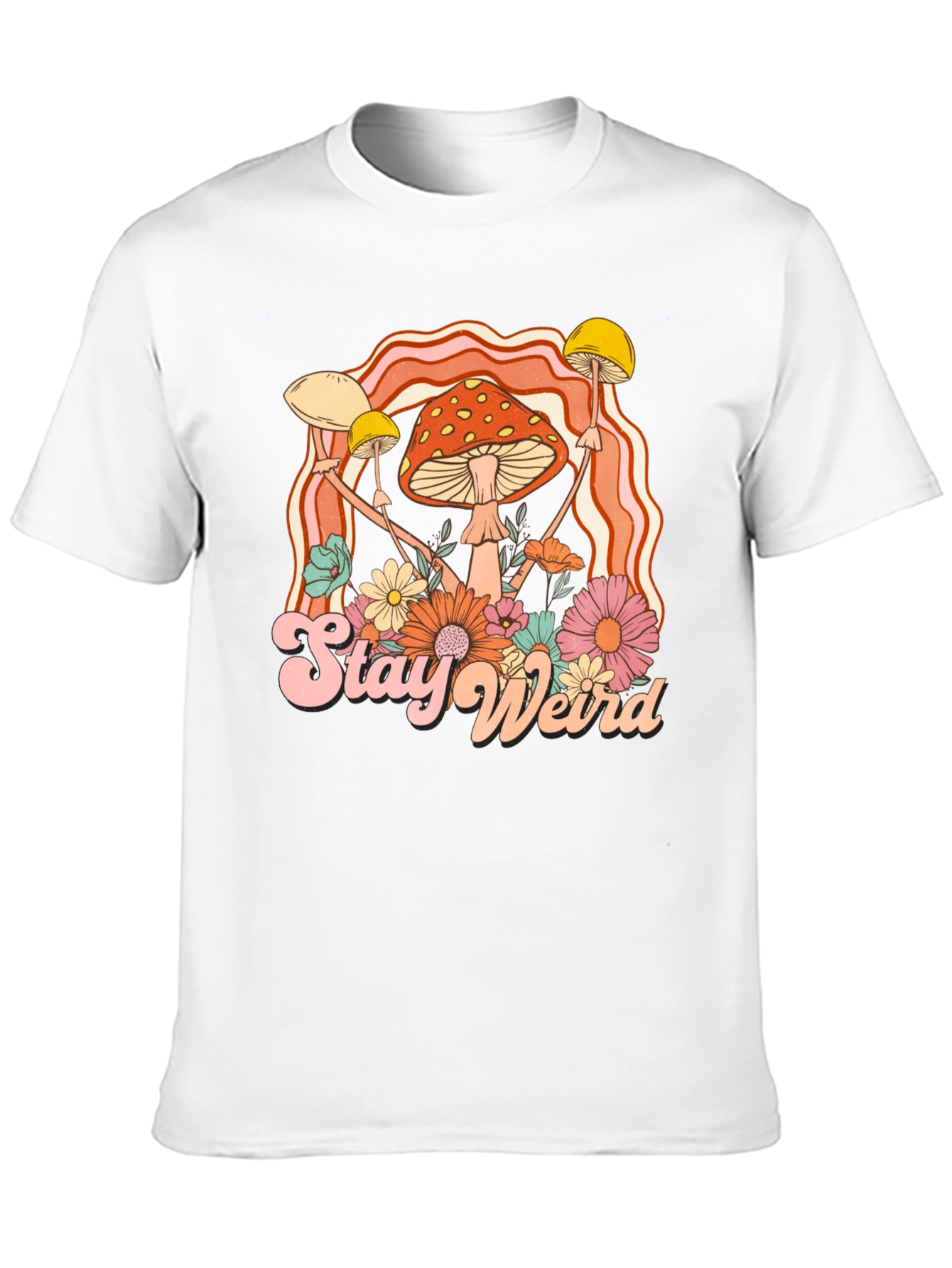 Embrace your unique side with this whimsical "Stay Weird" graphic t-shirt. The black tee features a vibrant, retro-inspired design with colorful mushrooms and flowers. The design pops with orange and red mushroom spots and various flowers in pink, yellow, orange and teal shades. Made from a comfortable material, this tee is perfect for casual outings, concerts, or expressing your individuality. Add a touch of psychedelic flair to your wardrobe. Available in multiple sizes.