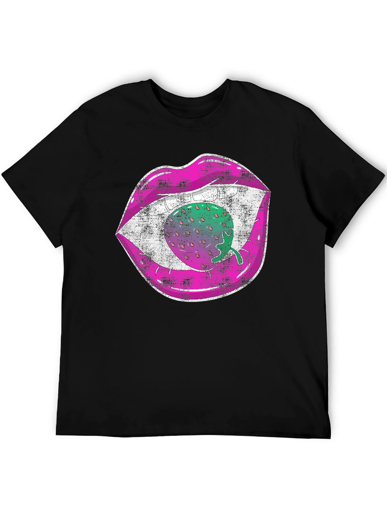 Make a statement with this bold graphic tee. This black t-shirt features a unique design of lips with a strawberry in its mouth. The lips are bright purple, with shades of green and purple in the strawberry. Perfect for everyday wear or a night out, this t-shirt offers a comfortable fit. The graphic design adds an edgy and eye-catching element to any outfit. Pair it with jeans or shorts for a casual yet stylish look. Add this creative piece to your wardrobe today!