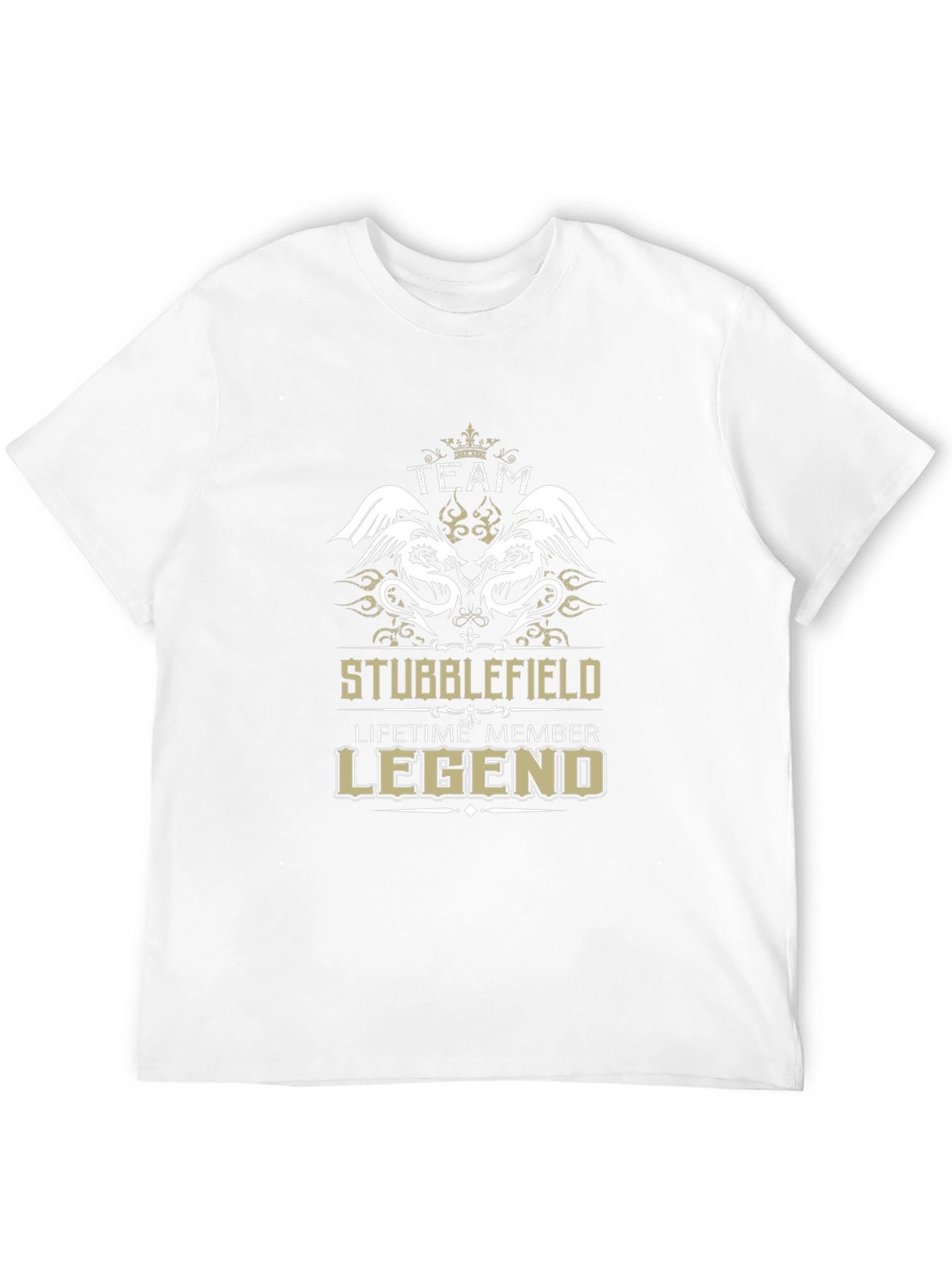 Show your Stubblefield pride with this black graphic tee! The shirt features a striking design with two dragons, a crown, and the text "TEAM STUBBLEFIELD LIFETIME MEMBER LEGEND". The print has a classic, slightly distressed look that adds to its charm. Made from comfortable fabric, this t-shirt is ideal for everyday wear, family reunions, or as a thoughtful gift for a Stubblefield family member. This unique tee is sure to turn heads and spark conversations. Embrace your heritage and display your family pride with this standout Stubblefield shirt. A must-have for any member of the Stubblefield crew!
