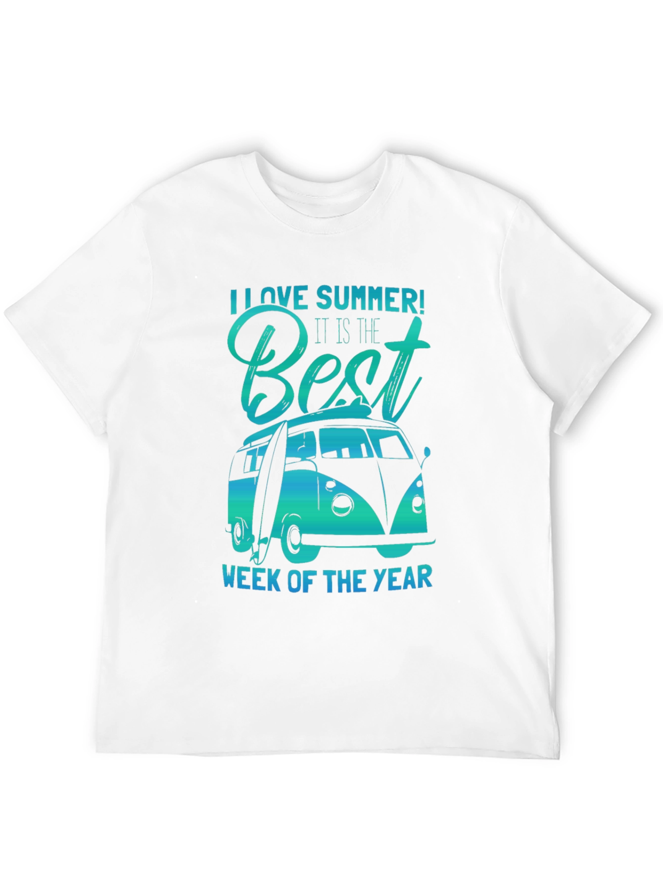 Embrace the summer vibes with this cool and stylish black t-shirt. The shirt features a vibrant blue and green graphic of a vintage van with a surfboard, accompanied by the text "I LOVE SUMMER! It is the Best Week of the Year." The design evokes a sense of adventure, relaxation, and the perfect beach getaway. Made from a soft and comfortable fabric, this tee is ideal for casual wear, vacations, or expressing your love for summer. Stand out from the crowd and let everyone know you are ready for summer adventures. A must-have for your seasonal wardrobe!