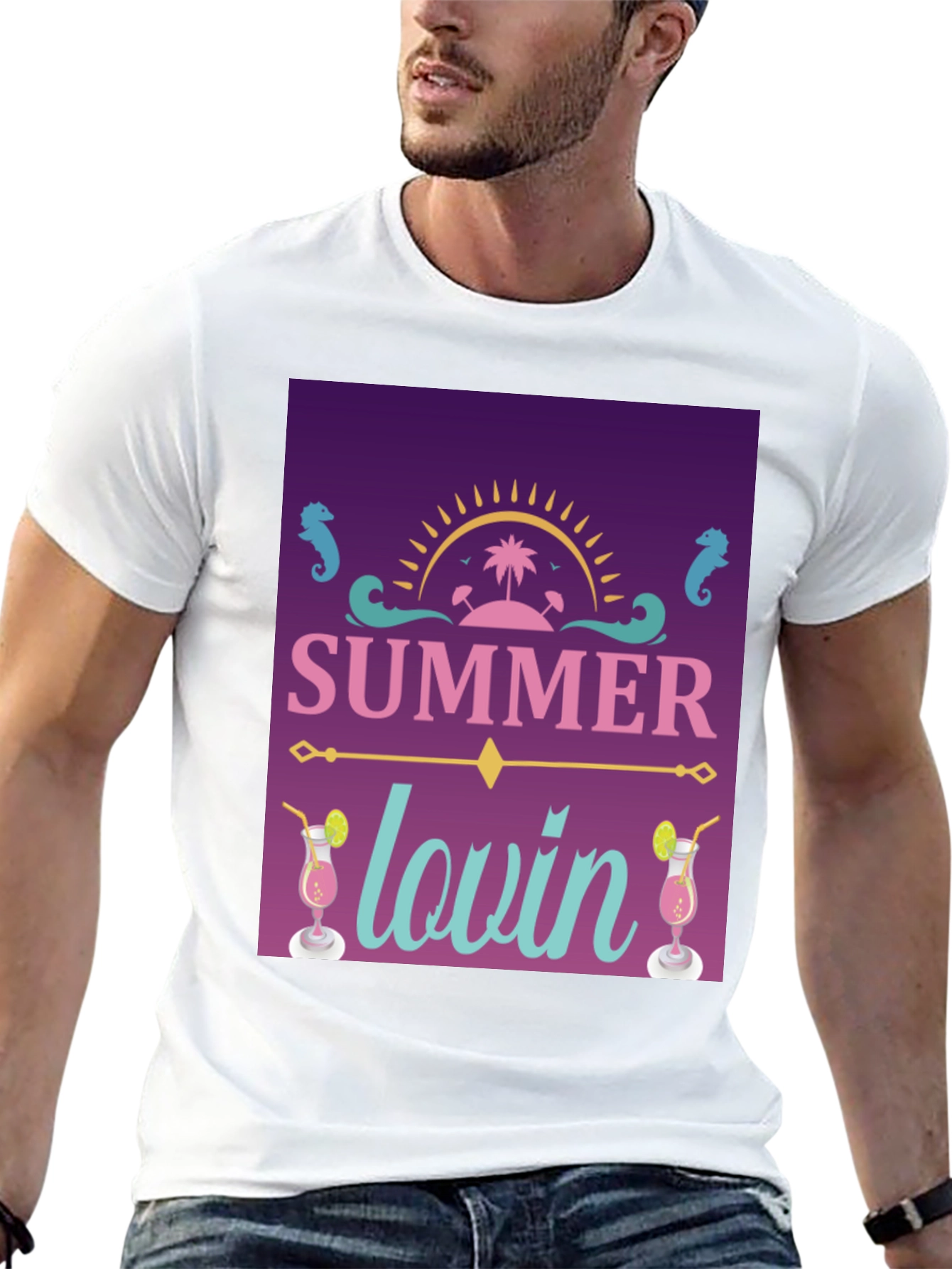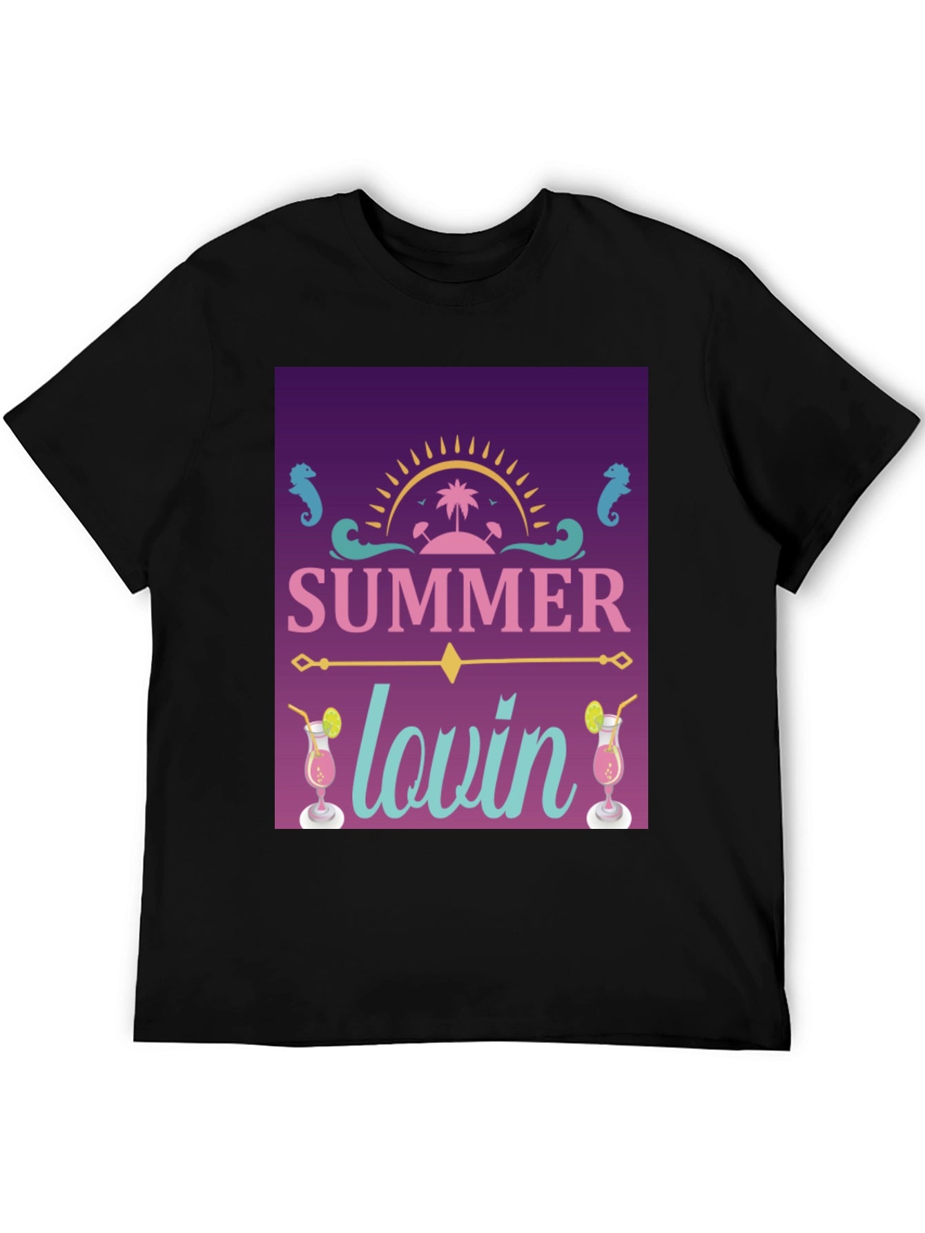 Embrace the summer vibes with this stylish black t-shirt! Featuring a vibrant graphic design, this shirt showcases a tropical paradise with a bright sun, palm trees, and refreshing cocktail drinks. The playful "Summer Lovin'" text adds a touch of fun to the overall design. Made from comfortable, breathable fabric, this t-shirt is perfect for casual outings, beach days, or summer parties. Stand out in style and let everyone know you're ready for some summer fun!