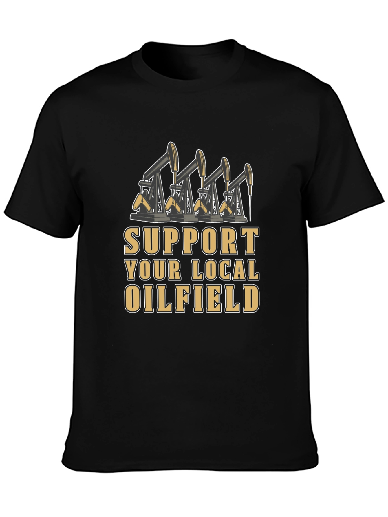Show your support with this bold, black graphic tee. Featuring a striking design of oil derricks and the slogan "Support Your Local Oilfield," this shirt is perfect for those in the oil industry or anyone who wants to make a statement. Made from a comfortable-looking fabric, it's ideal for everyday wear. The eye-catching design makes it a conversation starter and a great way to express your values and affiliations. A great addition to any casual wardrobe!
