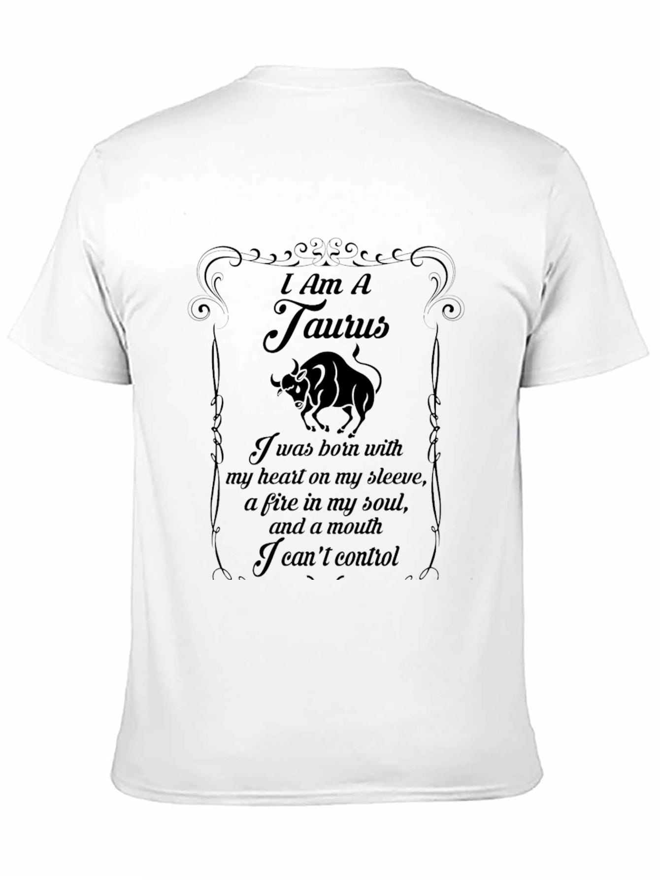 Showcase your astrological pride with this stylish black t-shirt. This bold tee features a distinctive "I Am A Taurus" graphic, complete with a Taurus bull illustration and the statement "I was born with my heart on my sleeve, a fire in my soul, and a mouth I can't control." Crafted from comfortable material, this shirt is perfect for casual wear, social gatherings, or as a unique gift for the Taurus in your life. Embrace your zodiac sign with this eye-catching and expressive t-shirt. A perfect conversation starter!