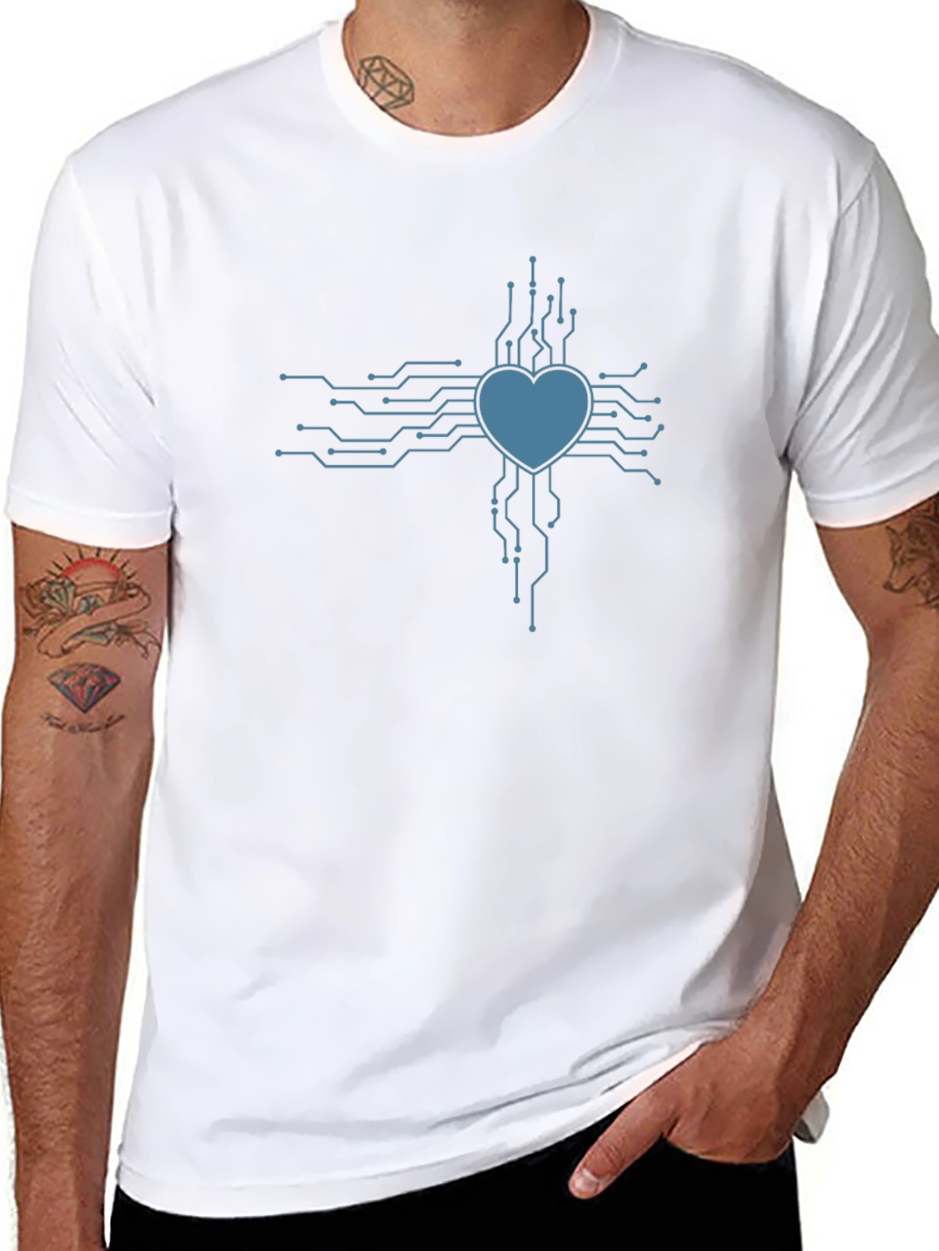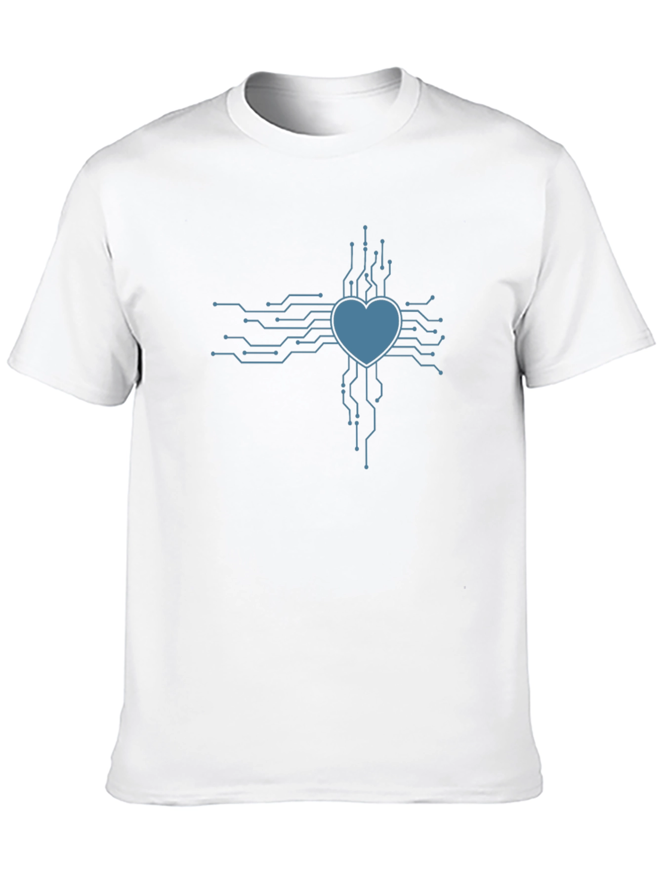 Show off your love for technology with this unique graphic tee! This black t-shirt features a stylized heart at the center of a digital circuit board design in a cool blue tone. Made from a comfortable-looking cotton blend, this tee is perfect for casual wear. The short-sleeve cut makes it ideal for warm weather or layering under a jacket. Whether you're a coder, gamer, or just a tech enthusiast, this shirt is a stylish way to express your passion. Great for everyday wear, meetups, or tech events. Get yours today and spread the love for tech!