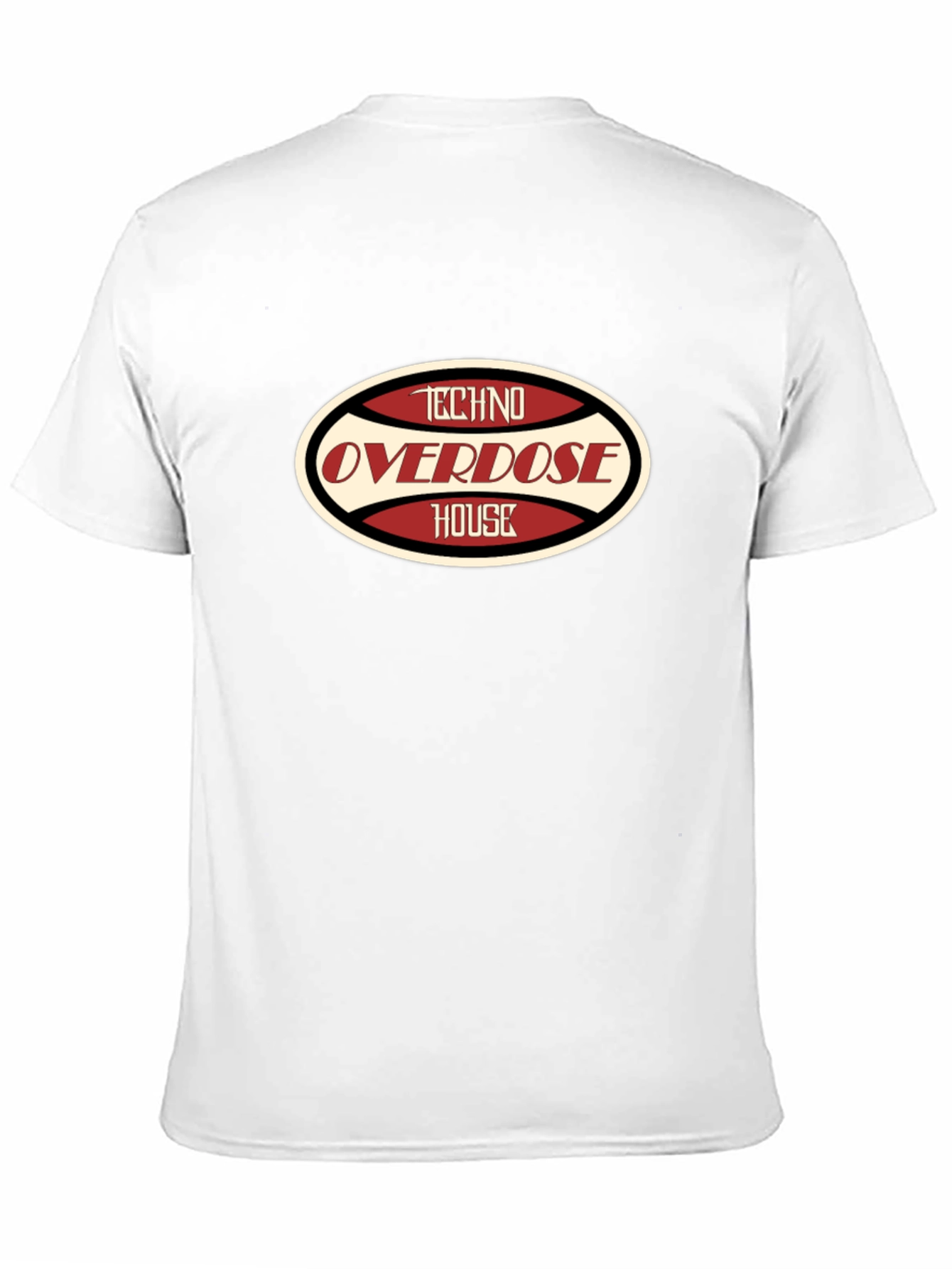Show your love for electronic music with this stylish black t-shirt. It features a unique oval-shaped graphic with the words "Techno Overdose House" in a retro-inspired font. The design incorporates red and beige colors, creating a striking contrast against the black background of the shirt. This tee is perfect for casual wear, music festivals, or club nights. Express your passion for techno and house music with this eye-catching and comfortable t-shirt. Made from soft, breathable fabric, it will keep you feeling cool and looking great all night long. Grab yours now and make a statement!