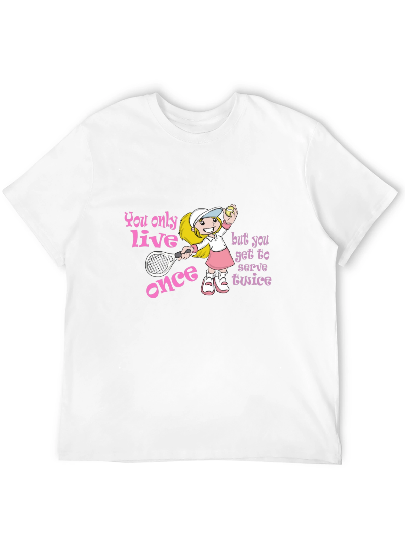 Serve up some fun with this eye-catching black t-shirt! Featuring a vibrant cartoon illustration of a tennis player, complete with a racquet and ball. The playful text, "You only live once but you get to serve twice," is perfect for tennis enthusiasts with a sense of humor. Made from what appears to be a soft and comfortable fabric, this tee is ideal for casual wear on and off the court. Show off your love for the game in style with this unique tennis-themed shirt – a great conversation starter!