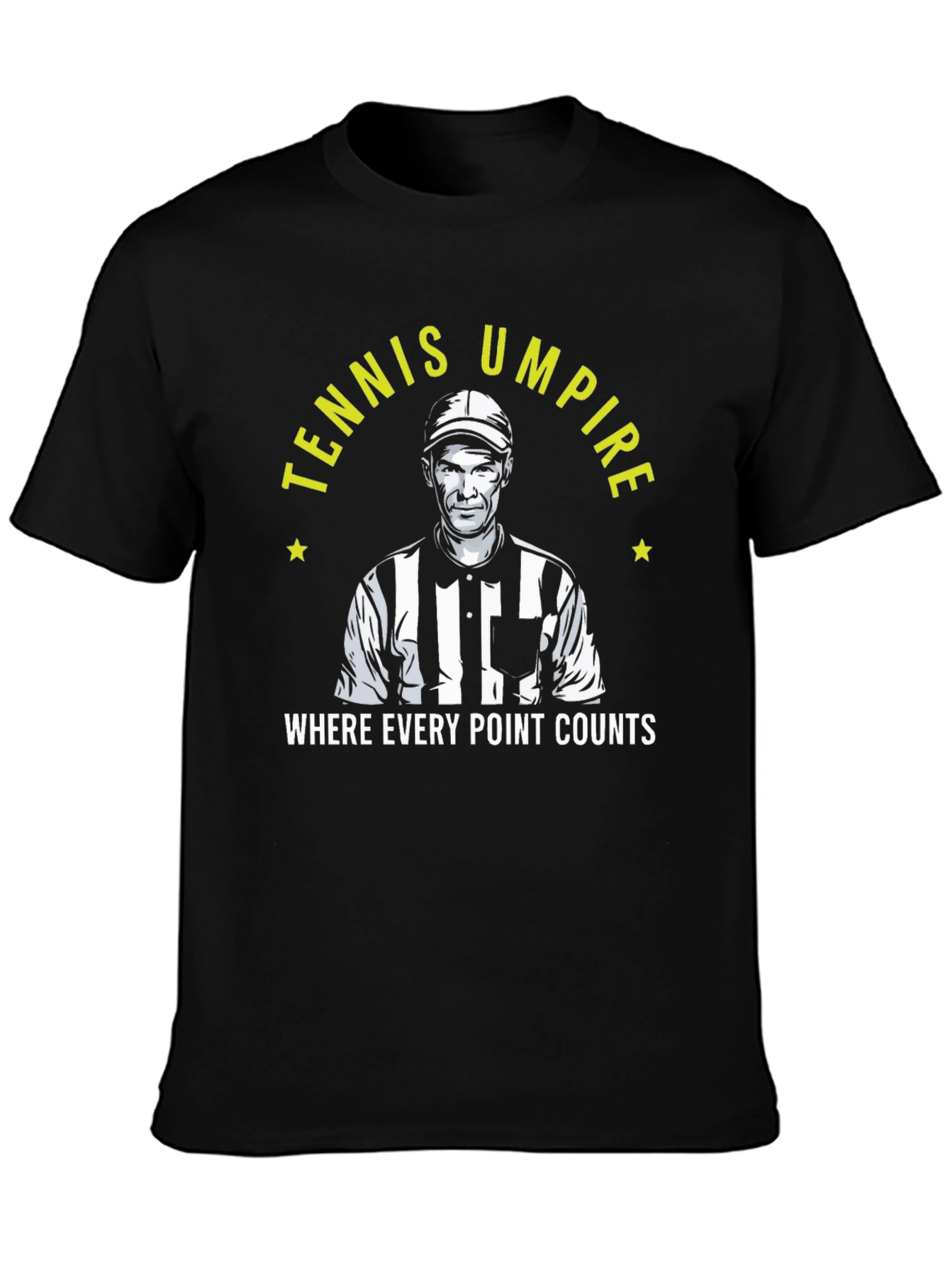 Serve up some style with this black t-shirt featuring a unique tennis umpire design! The shirt displays a classic umpire illustration, framed by the words "Tennis Umpire" in a bold, circular font and highlighted by star accents. Below the portrait, the slogan "Where Every Point Counts" adds a touch of competitive spirit. Crafted from a comfortable-looking fabric, this tee is perfect for tennis enthusiasts, players, and umpires alike. Wear it to the court, casual outings, or as a fun conversation starter. Make a statement on and off the court!