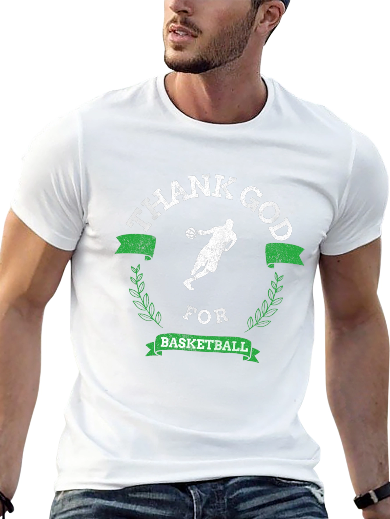 Show your love for basketball and faith with this stylish black t-shirt. Featuring a unique graphic design with the words 'Thank God For Basketball' arranged around a silhouette of a basketball player. The design includes decorative laurel leaves and banner accents in a subtle green, providing a touch of sporty elegance. Made from a comfortable fabric, this short-sleeve tee is perfect for everyday wear, whether you're shooting hoops, hitting the gym, or just hanging out with friends. It's a great way to express your passion for the game and your gratitude. A must-have addition to any basketball enthusiast's wardrobe.