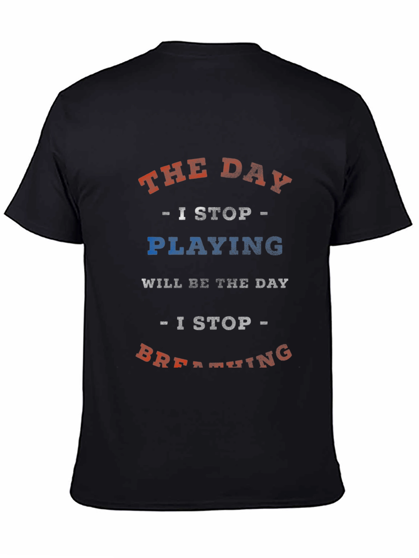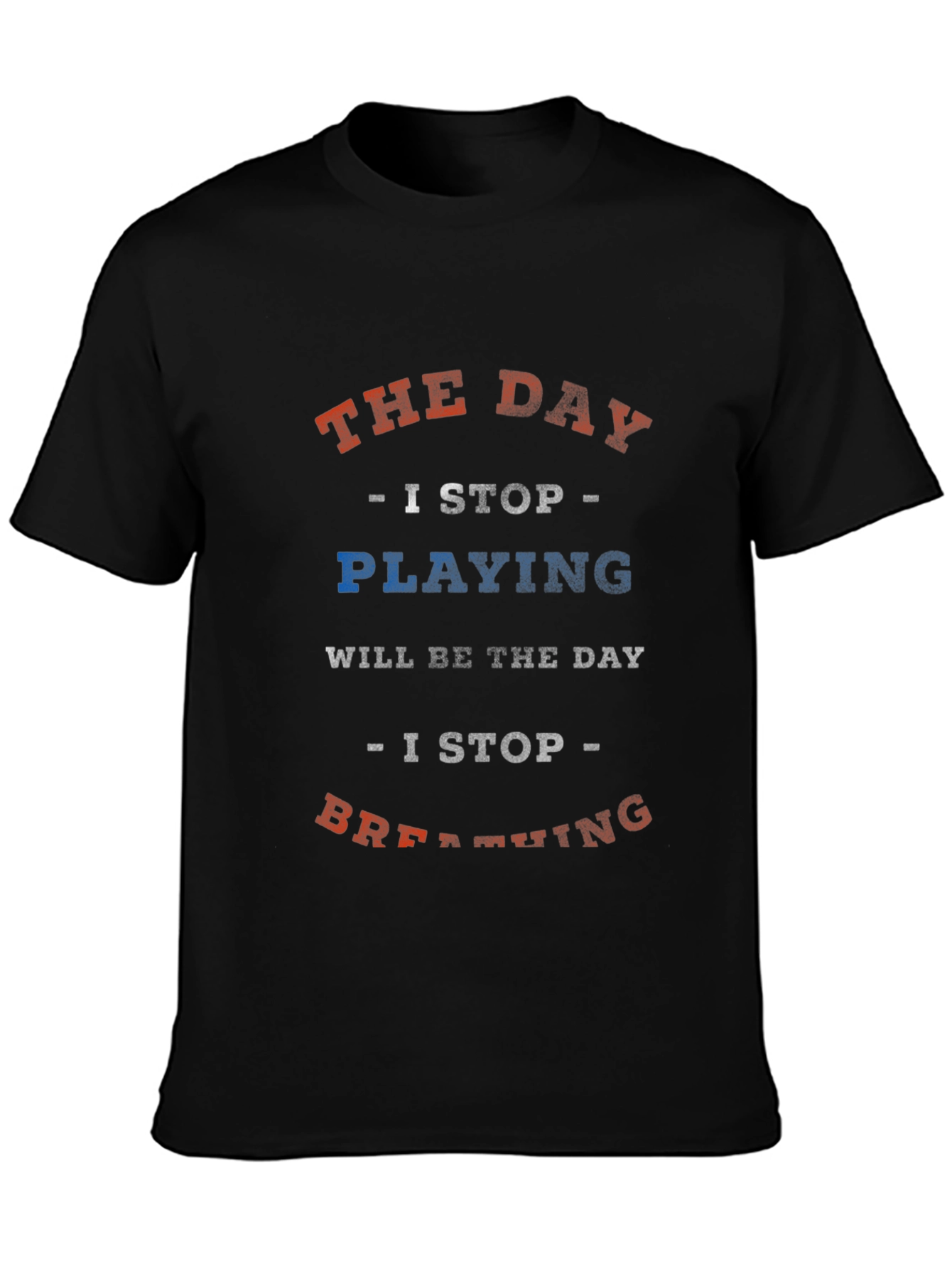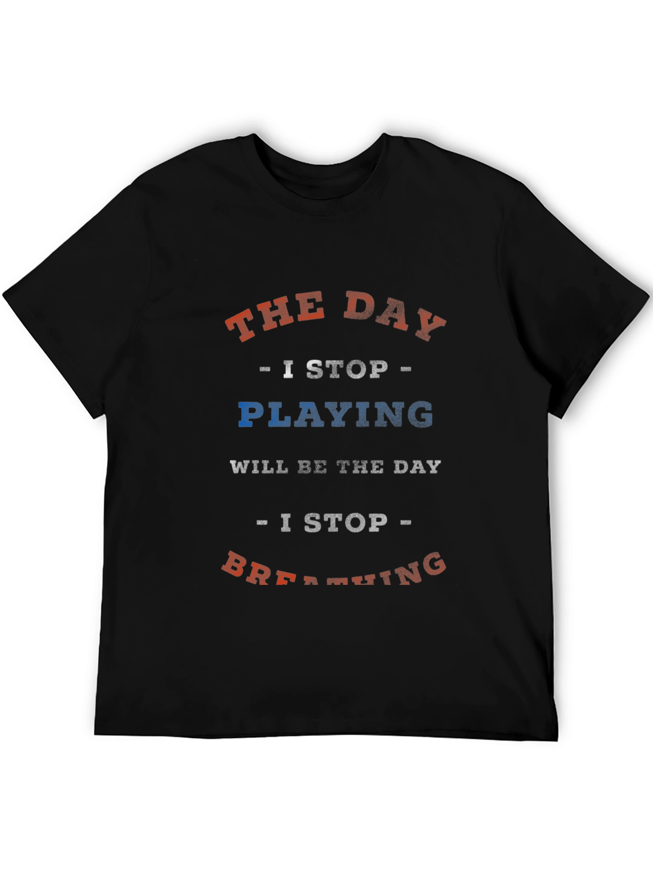 Show off your passion with this unique black t-shirt. The tee features the phrase "THE DAY - I STOP - PLAYING WILL BE THE DAY - I STOP - BREATHING" in a distressed red, white, and blue font. It's a casual and comfortable piece, perfect for everyday wear. Made from soft, breathable fabric, this tee is ideal for expressing your interests or giving as a gift to someone who feels the same way. Get yours today and let the world know what you love!