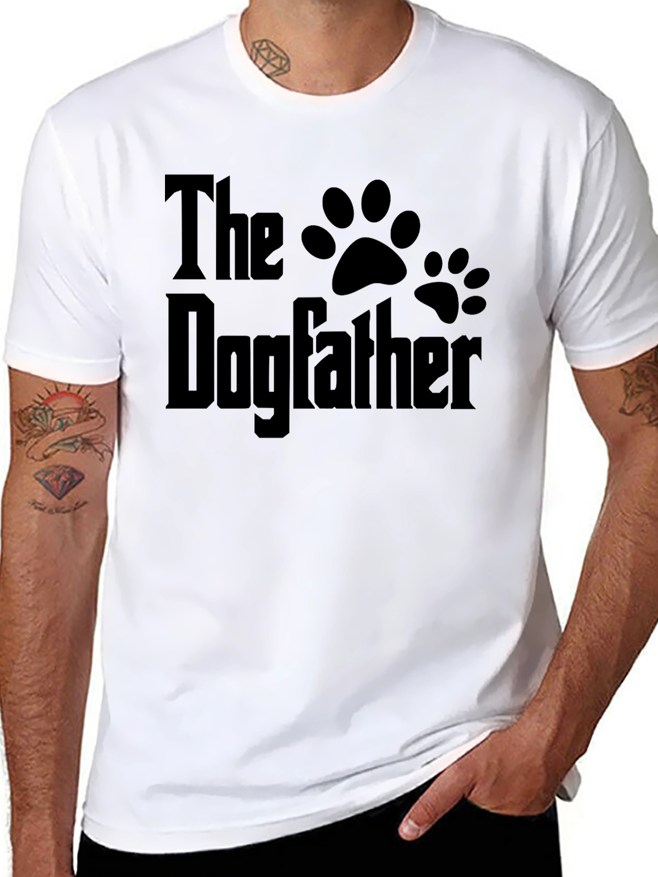 Show off your love for dogs with this funny "The Dogfather" t-shirt. The design features a playful parody of a classic movie title, complete with adorable paw prints. Made from a soft, breathable fabric, this tee offers all-day comfort and is perfect for casual wear. It's a great conversation starter and a fun way to express your passion for your furry friends. Ideal for dog walks, lounging at home, or as a gift for the dog lover in your life. Get ready for smiles and nods of approval when you sport this unique and humorous tee!