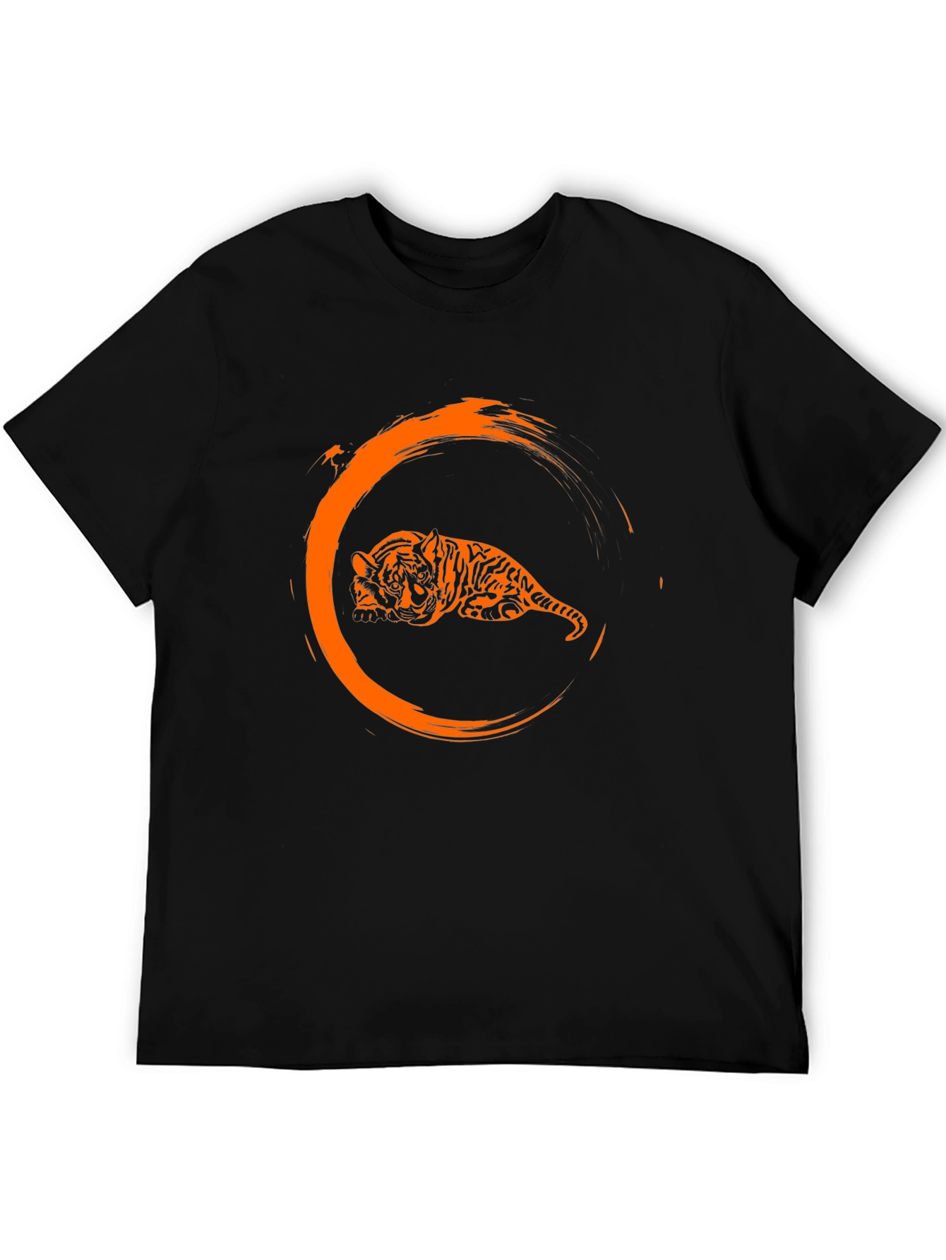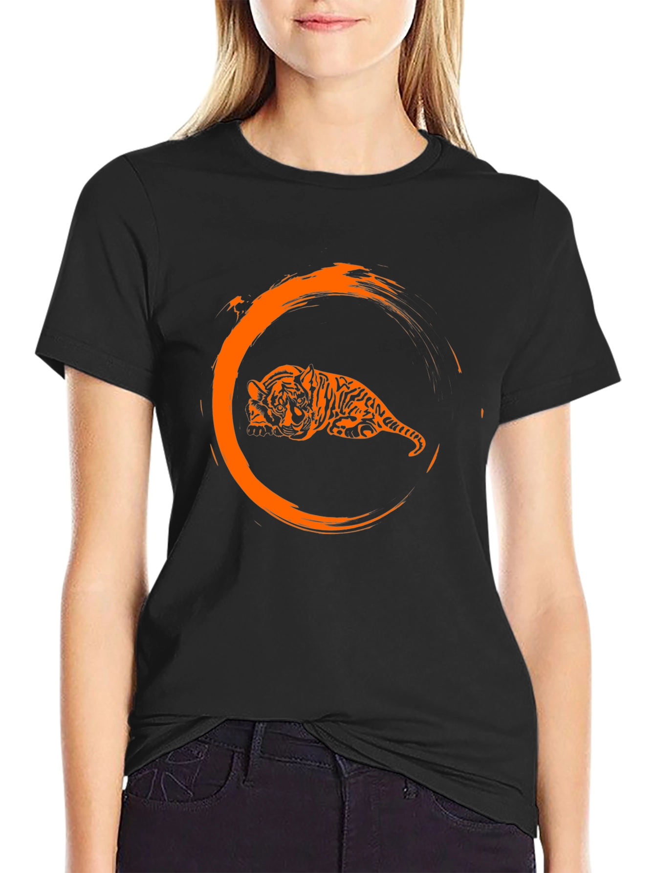 This stylish black t-shirt features a unique orange tiger graphic design. The design showcases a tiger within a circular brush stroke pattern, providing a striking and artistic look. Made from comfortable, breathable fabric, this tee is perfect for casual wear. Its classic fit makes it suitable for various body types. Ideal for those who appreciate wildlife-inspired art and want to add a touch of individuality to their wardrobe. Wear it on its own or layered under a jacket for a versatile style. A great choice for everyday activities or a relaxed night out.