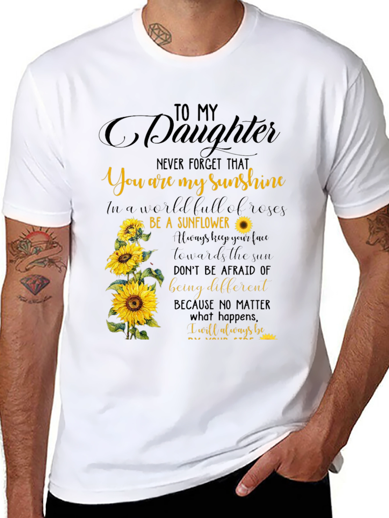 Show your daughter how much you care with this beautiful graphic tee! The shirt features the phrase "To My Daughter" along with a heartwarming message about being a sunflower and always being there. A vibrant sunflower design adds a touch of nature and positivity. This tee is perfect for everyday wear, special occasions, or as a thoughtful gift. Its inspirational message and comfortable fit make it a wardrobe staple she'll love. Get this touching tee for your daughter today and let her shine!