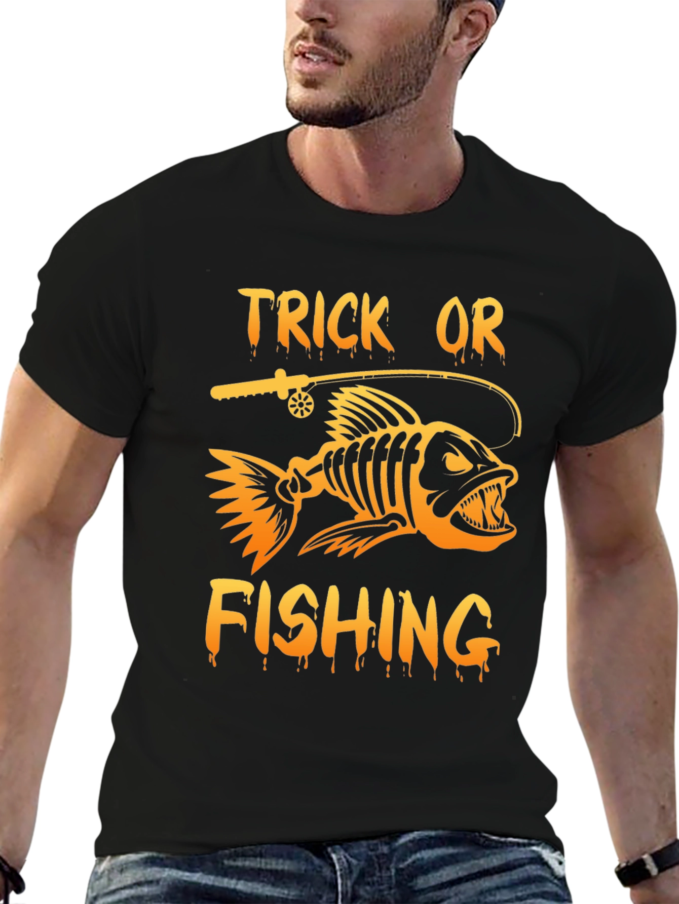 Get ready for Halloween with this eye-catching black t-shirt! Featuring a unique graphic of a fish skeleton combined with a fishing rod, it's the perfect blend of spooky and sporty. The words "Trick Or Fishing" are printed in a dripping orange font, adding to the Halloween theme. Made from comfortable material, this shirt is ideal for casual wear, Halloween parties, or fishing trips with a spooky twist. Show off your love for fishing and the Halloween spirit with this must-have tee. Great gift for fishing lovers!