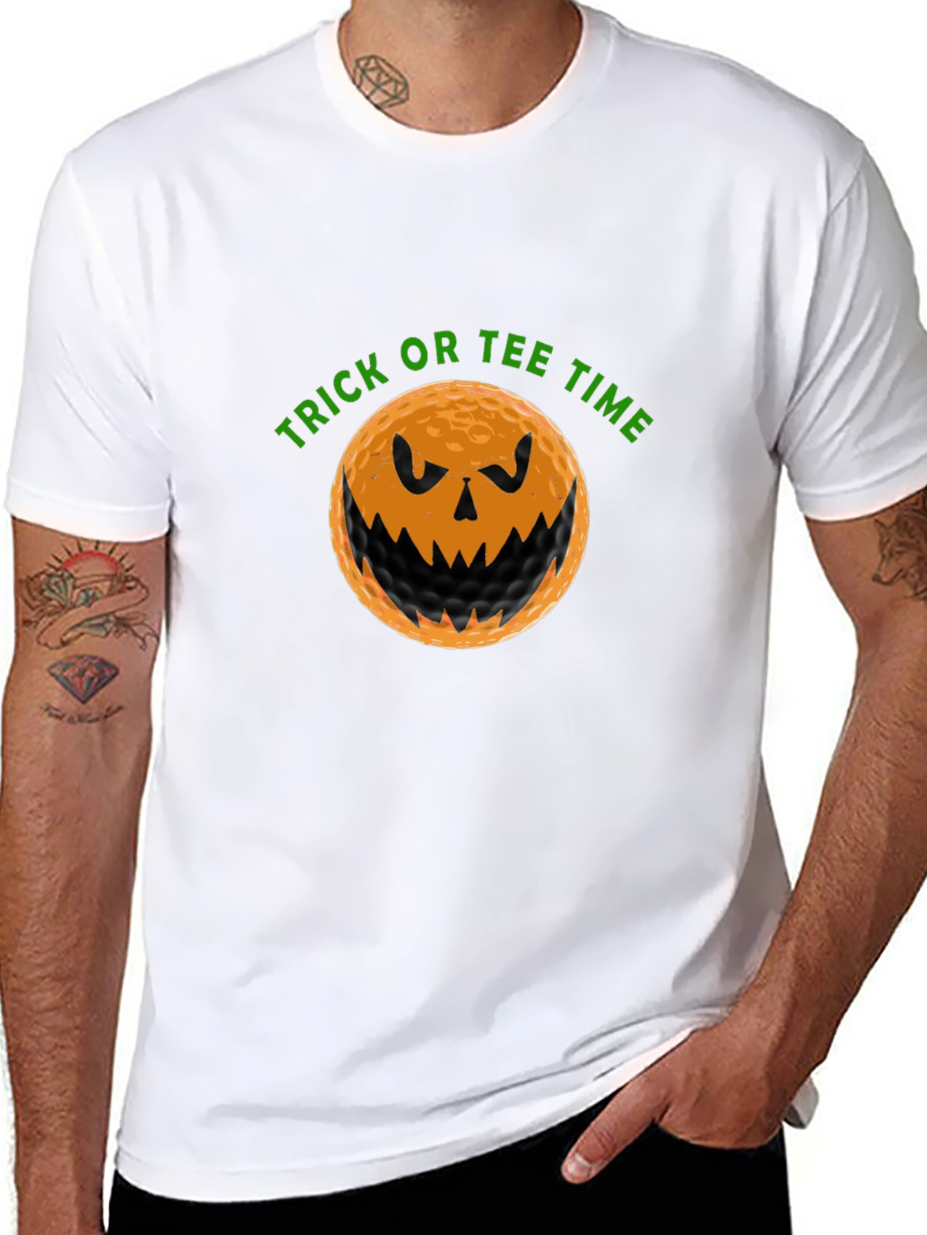 Get ready for spooky season on the golf course with this fun "Trick or Tee Time" t-shirt! The black tee features a vibrant graphic of a golf ball designed as a jack-o'-lantern, complete with spooky eyes and a toothy grin. The phrase "Trick or Tee Time" is playfully displayed in green above the pumpkin golf ball. Made from a comfortable fabric blend, this t-shirt is perfect for casual wear, golf outings, or Halloween-themed parties. Show off your love for golf and Halloween with this unique and eye-catching design. Available in various sizes.