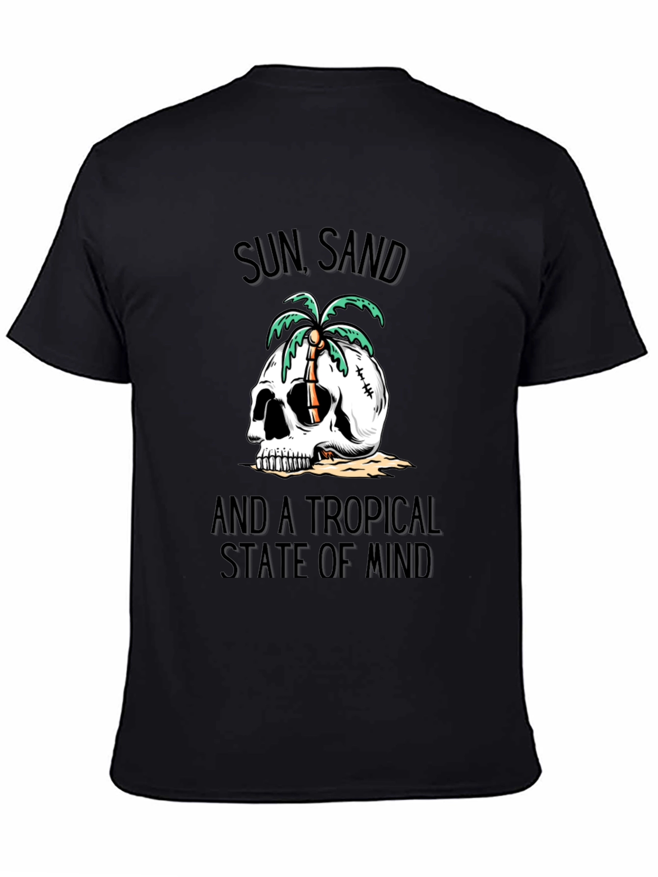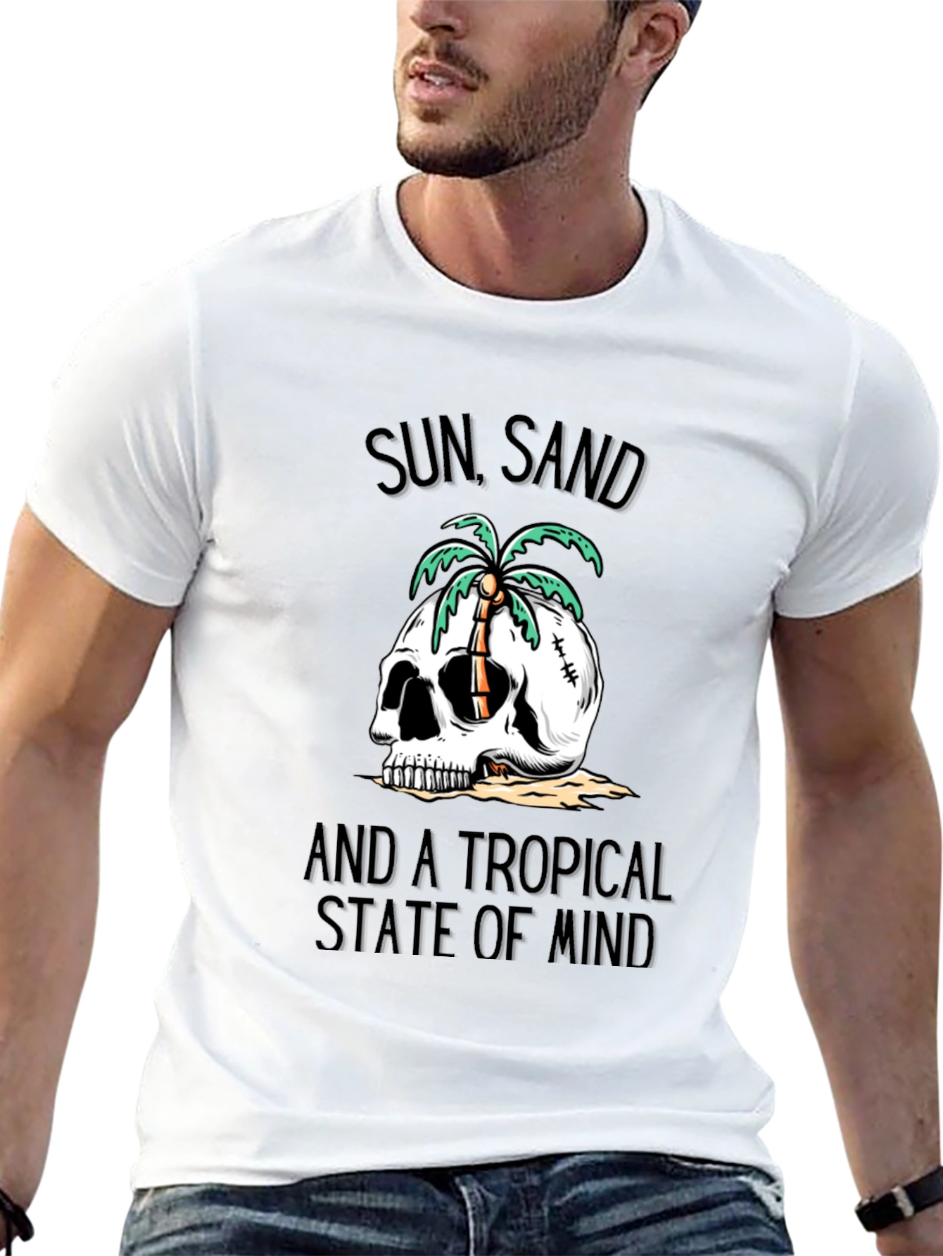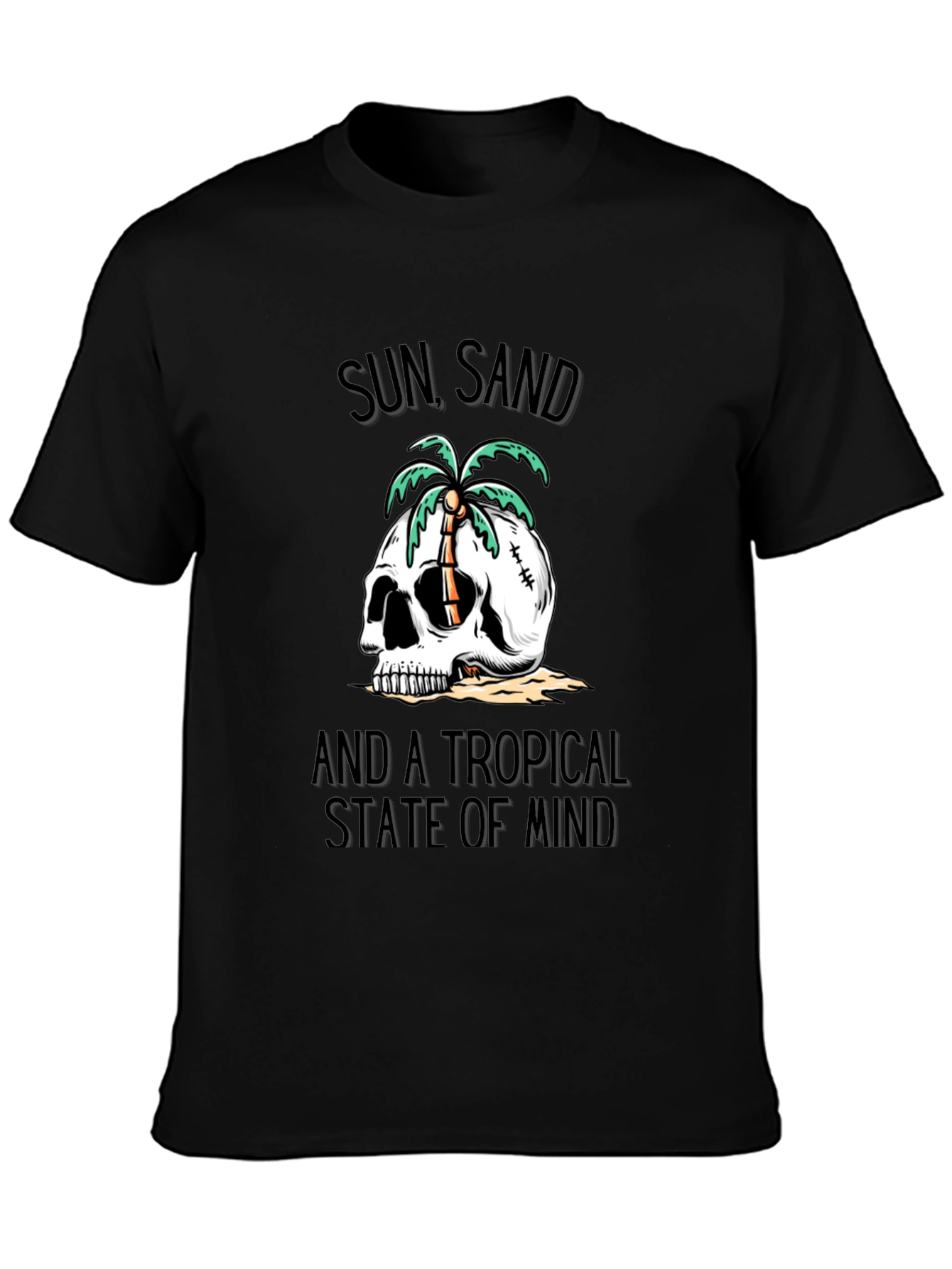 Embrace the island vibe with this unique graphic t-shirt. Featuring a skull with a palm tree sprouting from the top, this tee is perfect for those who dream of sun, sand, and tropical breezes. The bold design is eye-catching and conversation-starting. Made from comfortable, breathable fabric, this t-shirt is ideal for casual wear, beach outings, or simply expressing your carefree spirit. The design also features the saying "Sun, Sand, and a Tropical State of Mind". Let your style reflect your vacation dreams with this must-have addition to your wardrobe. It will be a perfect gift for anyone wanting a beachy look.