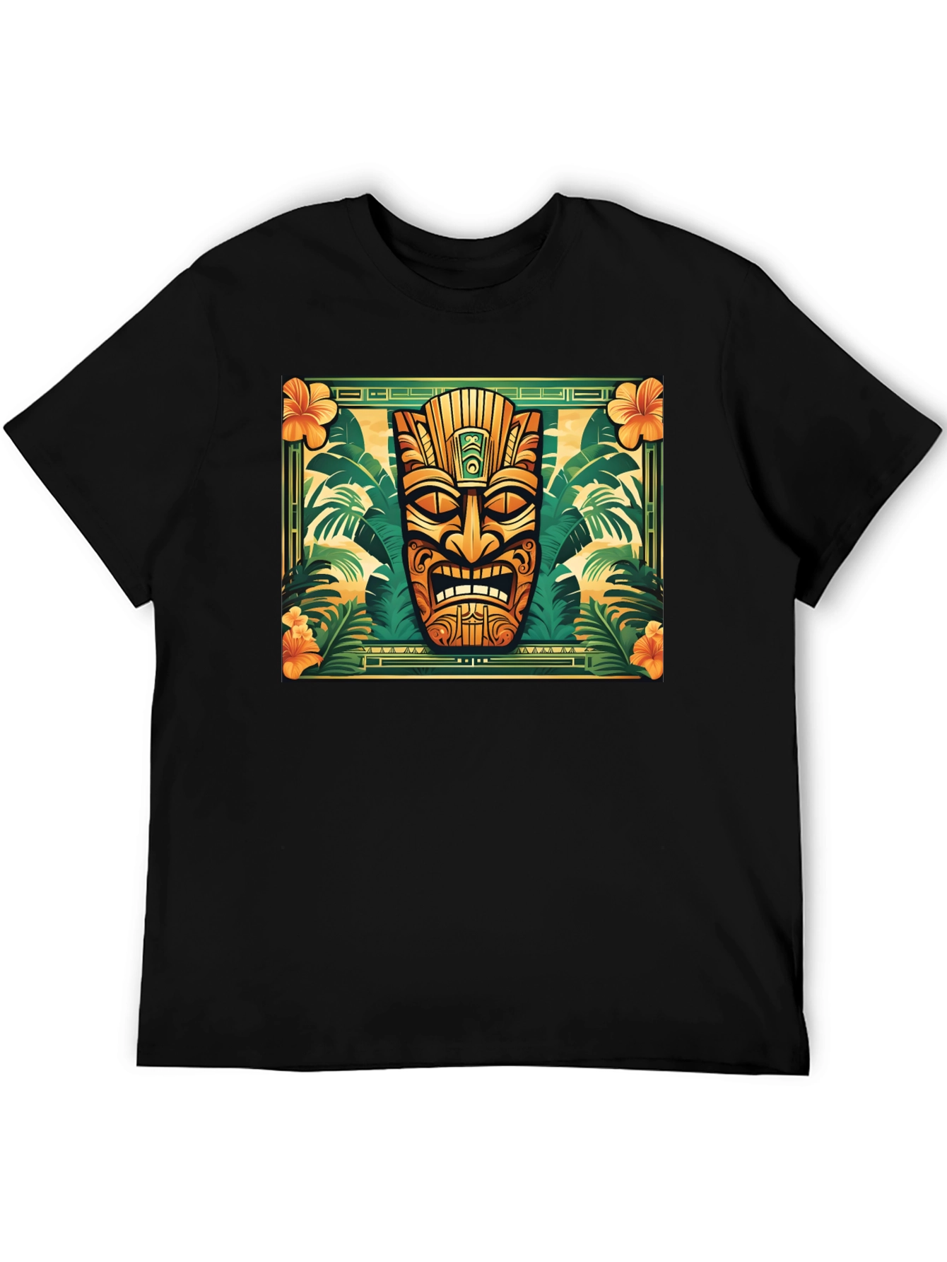 Embrace island vibes with this stylish black graphic tee. The shirt features a vibrant design of a Tiki mask, framed by lush tropical foliage and hibiscus flowers, all rendered in bold, eye-catching colors. This tee is made from a soft-looking fabric that appears comfortable for all-day wear. Perfect for casual outings, beach trips, or simply adding a touch of tropical flair to your wardrobe, this T-shirt is a unique statement piece. Pair it with shorts or jeans for a relaxed yet stylish look. A must-have for anyone who loves tropical designs and wants to stand out in style.