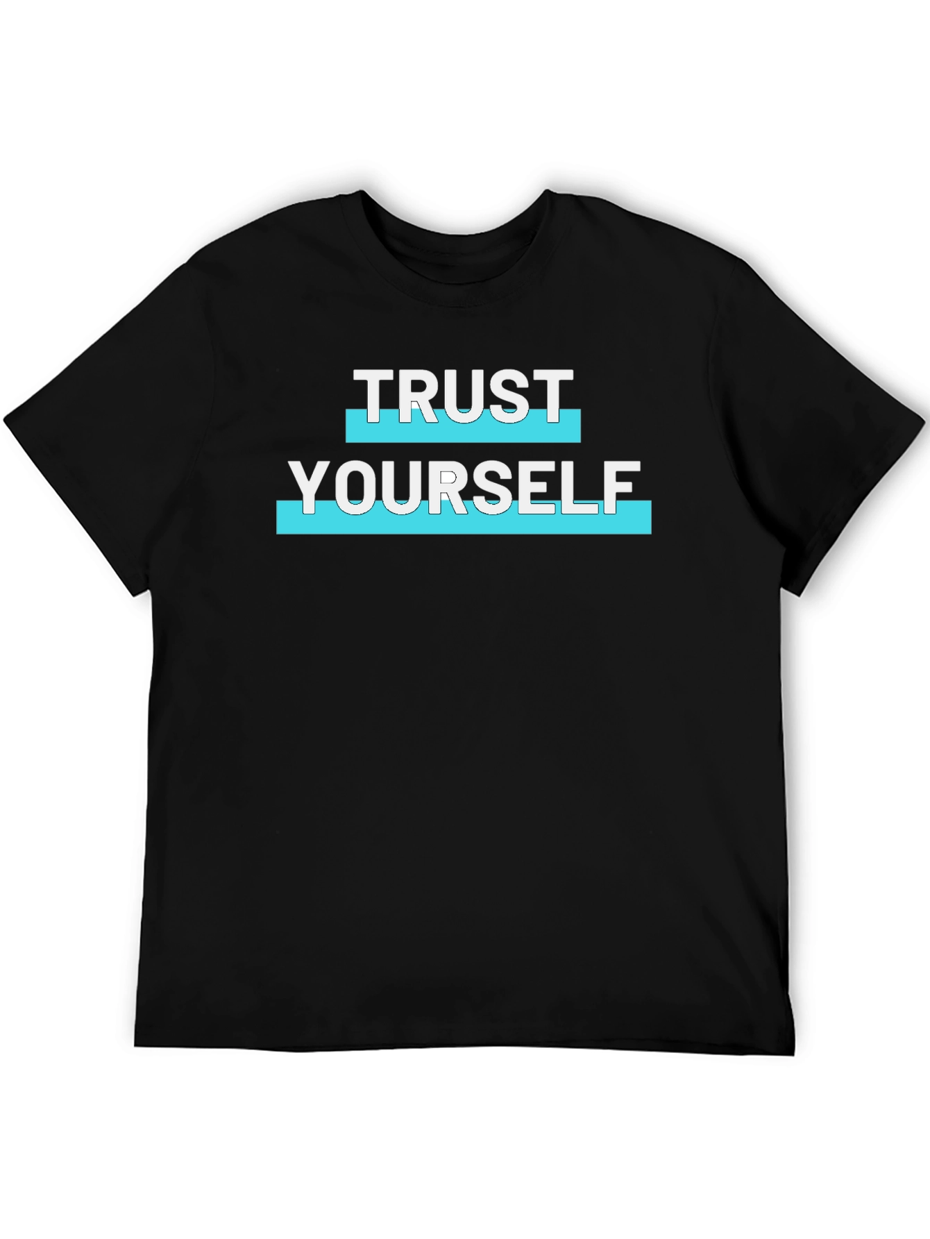 Embrace positive vibes with this stylish black graphic tee. The shirt features the empowering phrase "Trust Yourself" in bold, white letters, accented by striking light blue lines above and below. Made from a soft, comfortable fabric, this tee offers a relaxed fit that's perfect for everyday wear. Whether you're hitting the gym, hanging out with friends, or simply expressing your individuality, this t-shirt is a versatile addition to your wardrobe. Pair it with jeans, shorts, or joggers for an effortlessly cool look. Show the world you're confident and self-assured with this trendy and inspiring t-shirt.