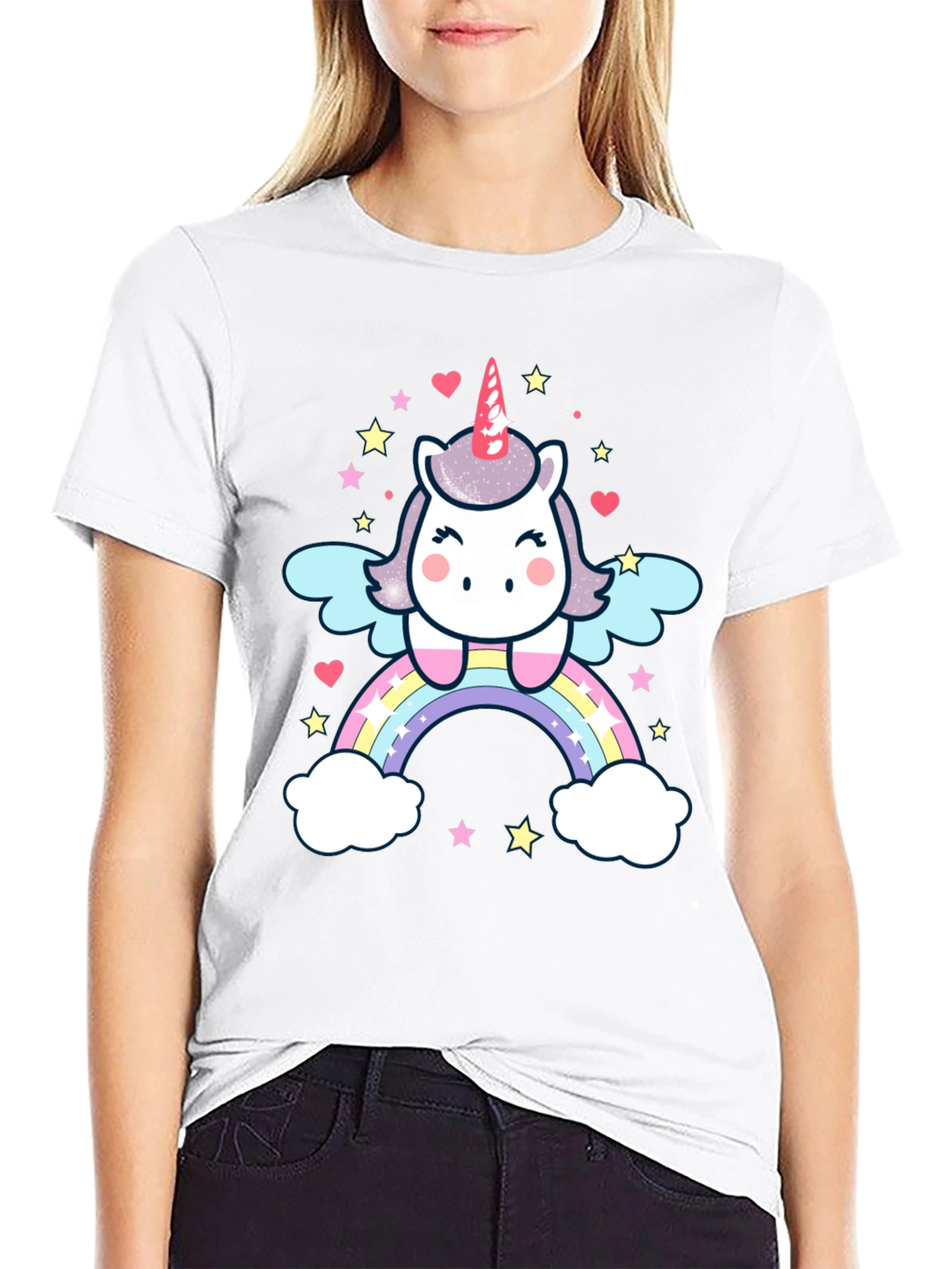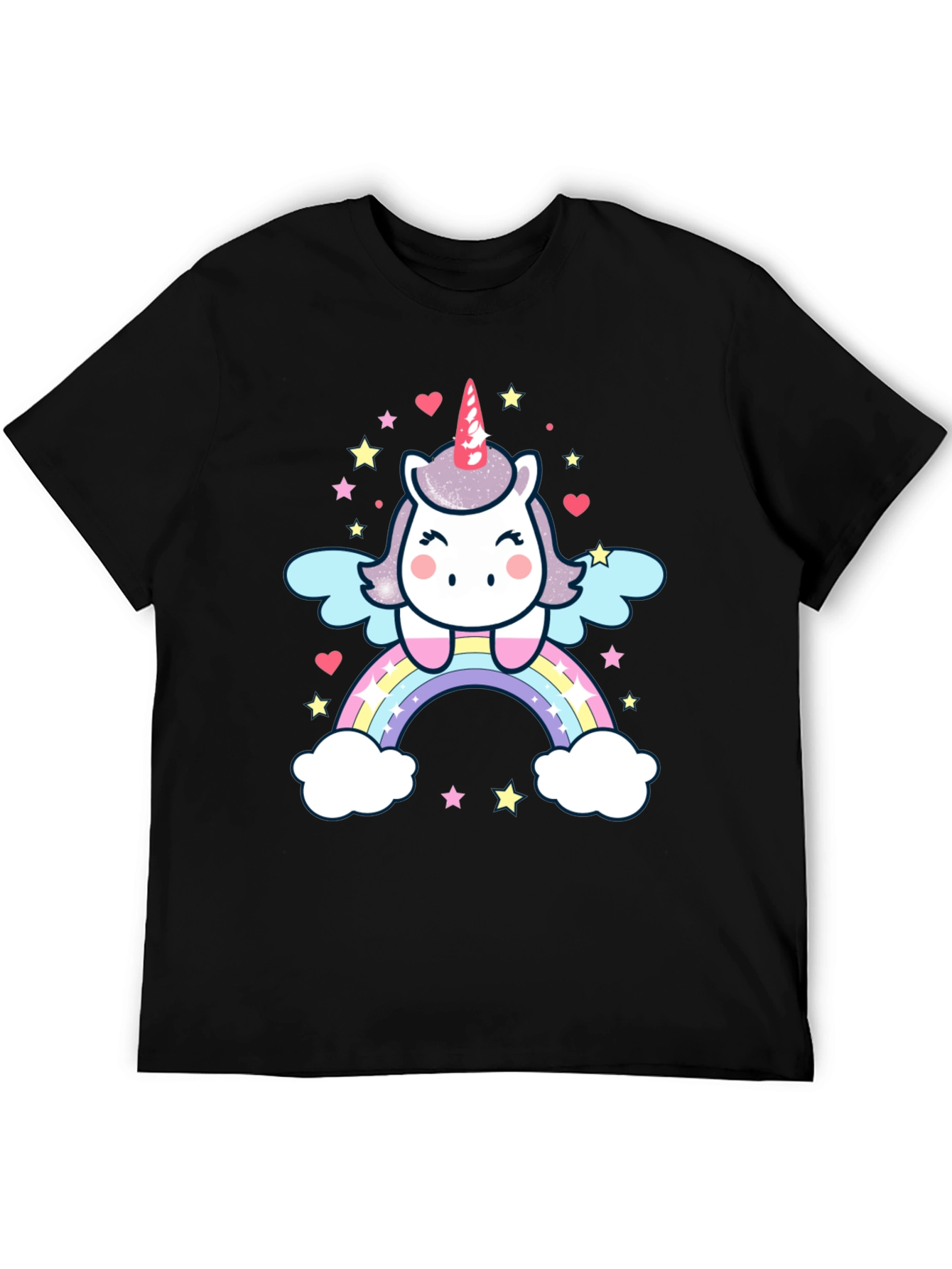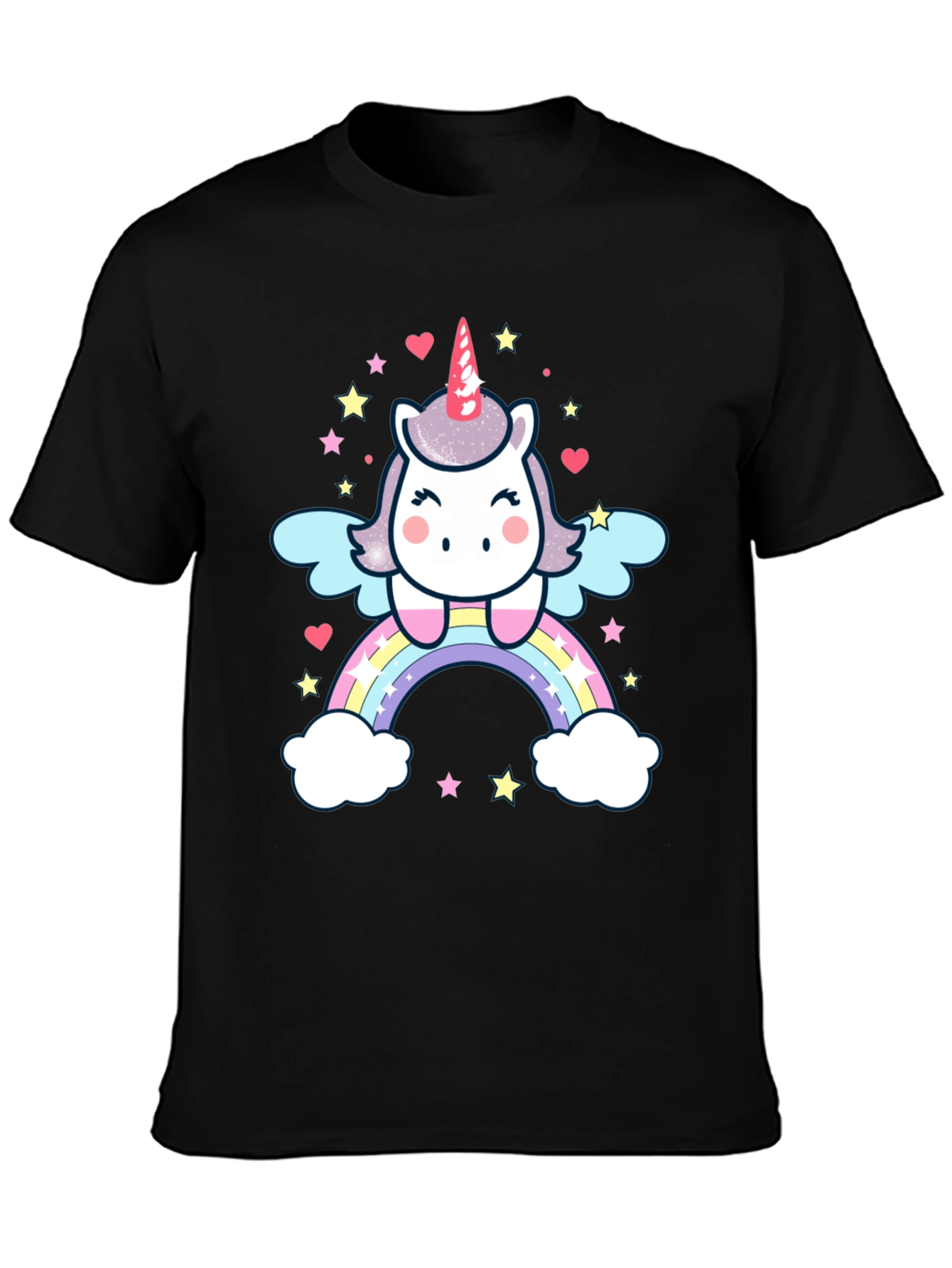 Add a touch of magic to your wardrobe with this adorable black t-shirt! Featuring a charming cartoon unicorn sitting atop a vibrant rainbow, surrounded by hearts and stars, this tee is perfect for anyone who loves whimsical designs. The cute unicorn graphic is bright and colorful, making it a fun and eye-catching piece. Made from a soft, comfortable fabric, this t-shirt is ideal for casual wear. Whether you're lounging at home or heading out with friends, this unicorn rainbow tee is sure to bring a smile to your face and brighten up your day. It's a delightful addition to any casual outfit!