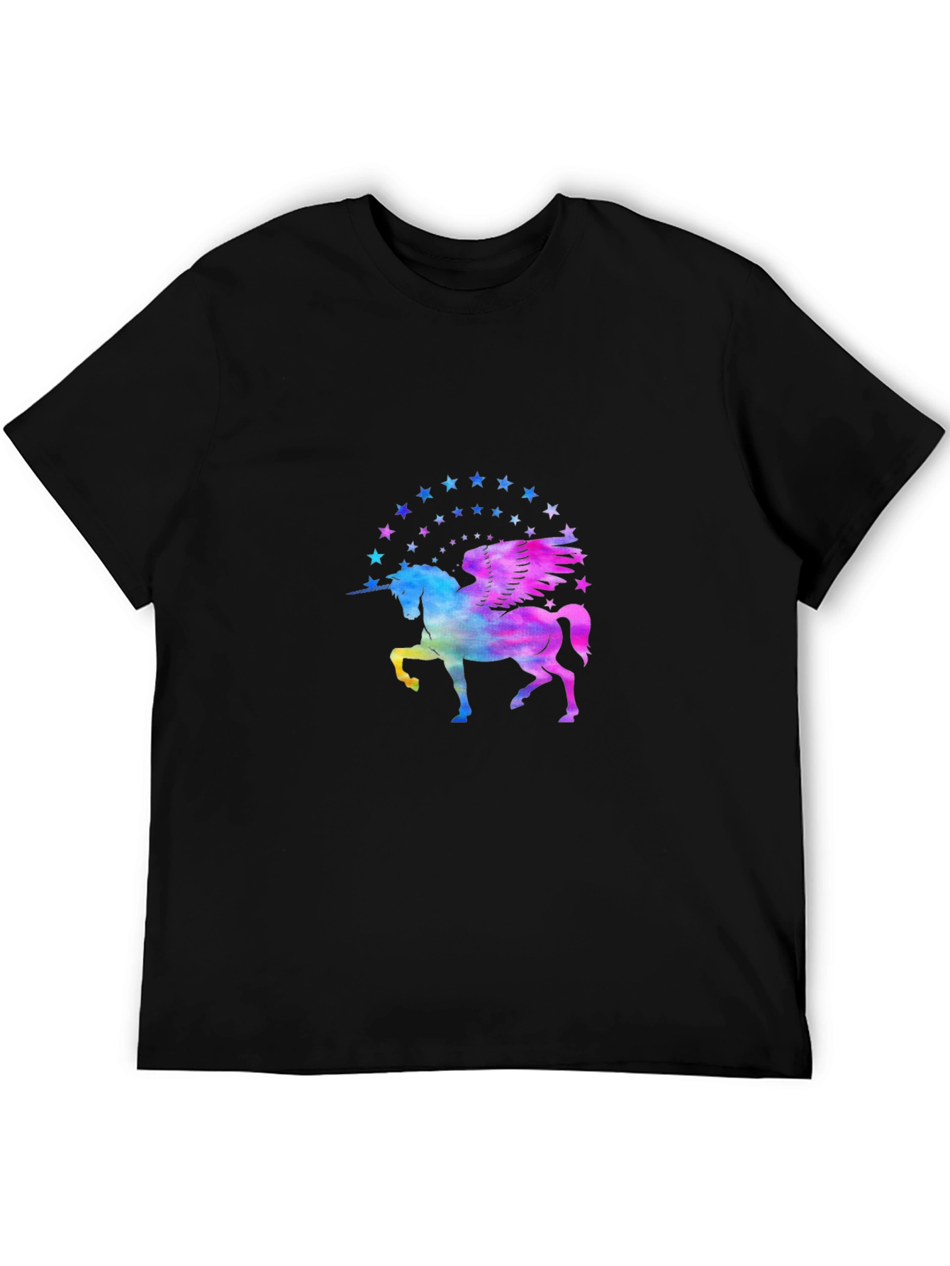 Show off your love for fantasy with this stylish black t-shirt. Featuring a vibrant, colorful unicorn graphic surrounded by stars, this shirt is sure to turn heads. The detailed design showcases a winged unicorn in a rainbow spectrum. Made from comfortable, breathable fabric, this tee is perfect for everyday wear. Great for casual outings, concerts, or just relaxing at home, this unique t-shirt makes a statement. Add a touch of magic to your wardrobe with this eye-catching unicorn tee!