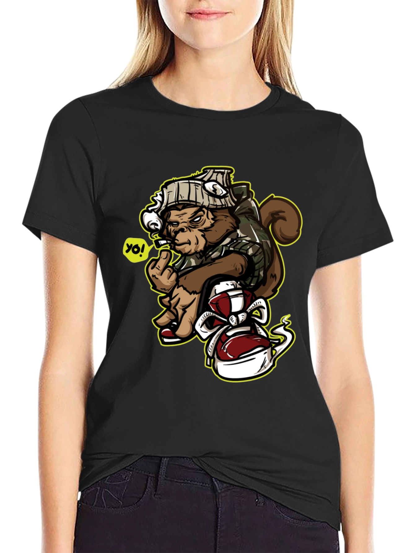 Show off your street style with this unique black graphic tee! Featuring a bold illustration of an ape wearing a beanie and camo jacket, sitting on a pair of sneakers while smoking, and flipping the bird. The vibrant colors and detailed design make it a standout piece. Made from comfortable fabric, this t-shirt is perfect for everyday wear, casual outings, or making a statement. Pair it with your favorite jeans or shorts for an effortlessly cool look. Add some edge to your wardrobe with this eye-catching tee.