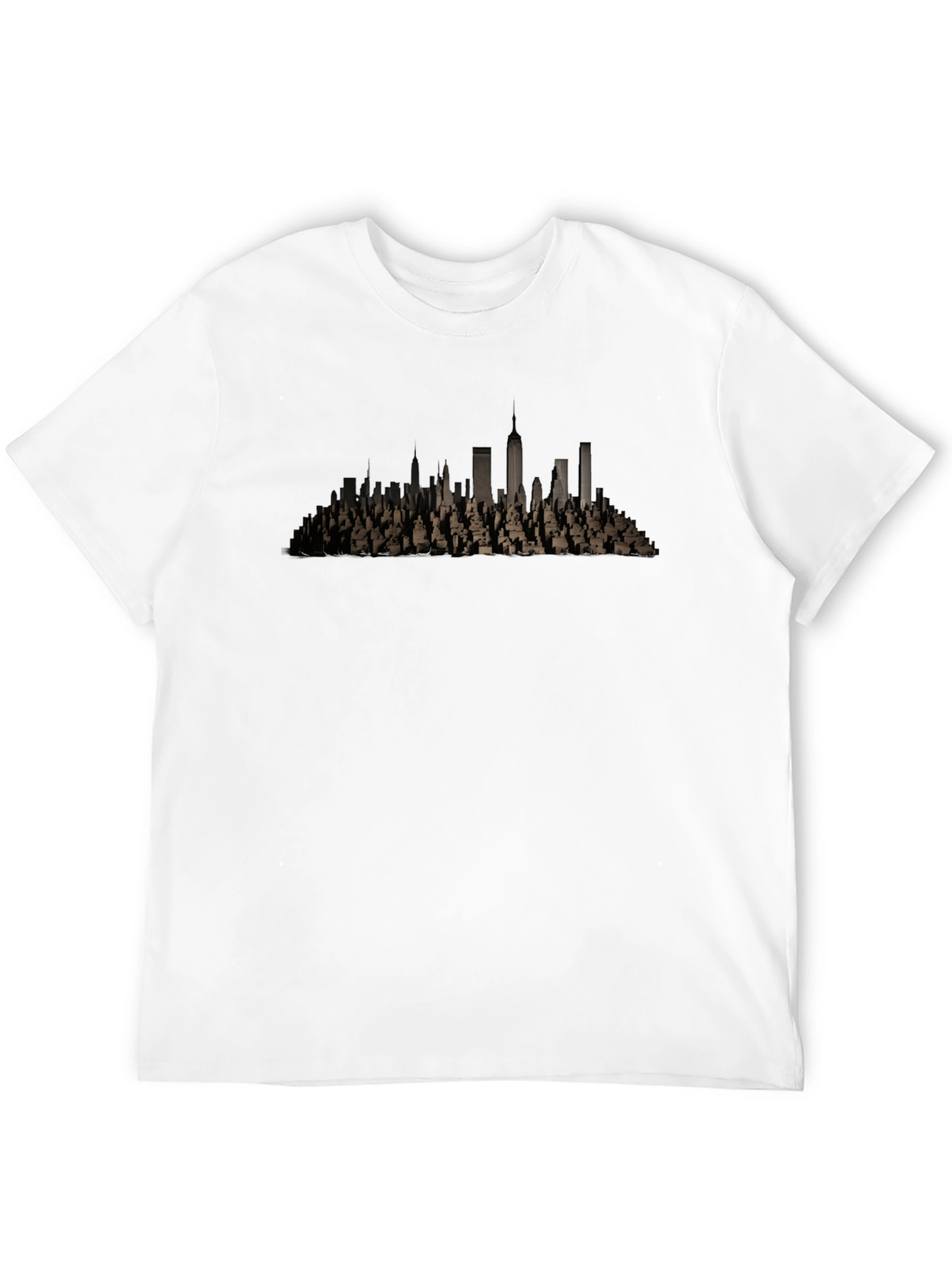 Embrace sleek style with this striking black t-shirt. Featuring a unique skyline silhouette graphic, this tee captures the essence of modern urban living. The design showcases silhouetted buildings and adds an edgy touch to a classic wardrobe staple. Crafted from a comfortable fabric, this short-sleeve shirt offers a relaxed fit perfect for everyday wear. Whether you're strolling through the city streets or hanging out with friends, this tee is sure to make a statement. Pair it with jeans or shorts for a casual yet fashionable look.