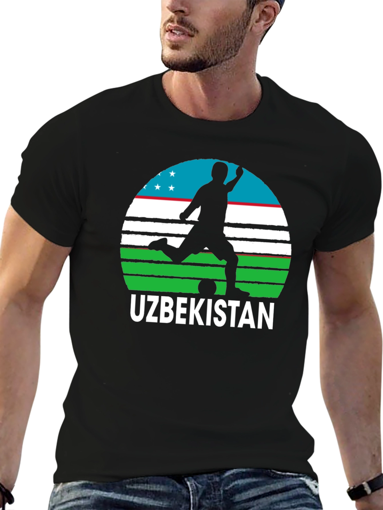 Show your support for Uzbekistan with this stylish black t-shirt! Featuring a bold, circular graphic with the Uzbekistan flag colors, this shirt also showcases a soccer player silhouette mid-kick. The word 'UZBEKISTAN' is prominently displayed, making it clear where your allegiance lies. Perfect for game days, casual wear, or as a unique gift for soccer fans. Made from comfortable, breathable fabric, this tee is designed for both style and comfort. Wear your pride with this eye-catching Uzbekistan soccer t-shirt.