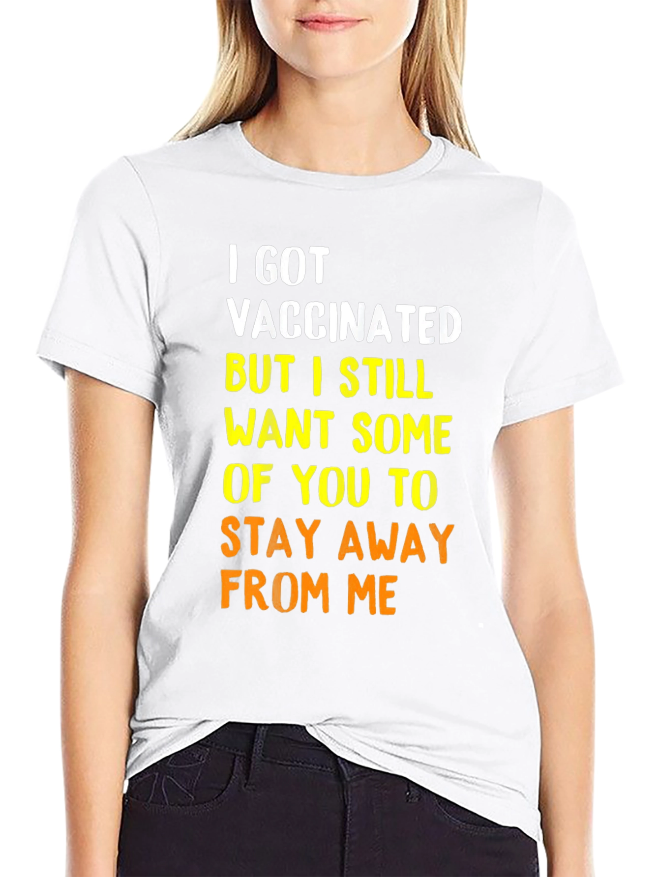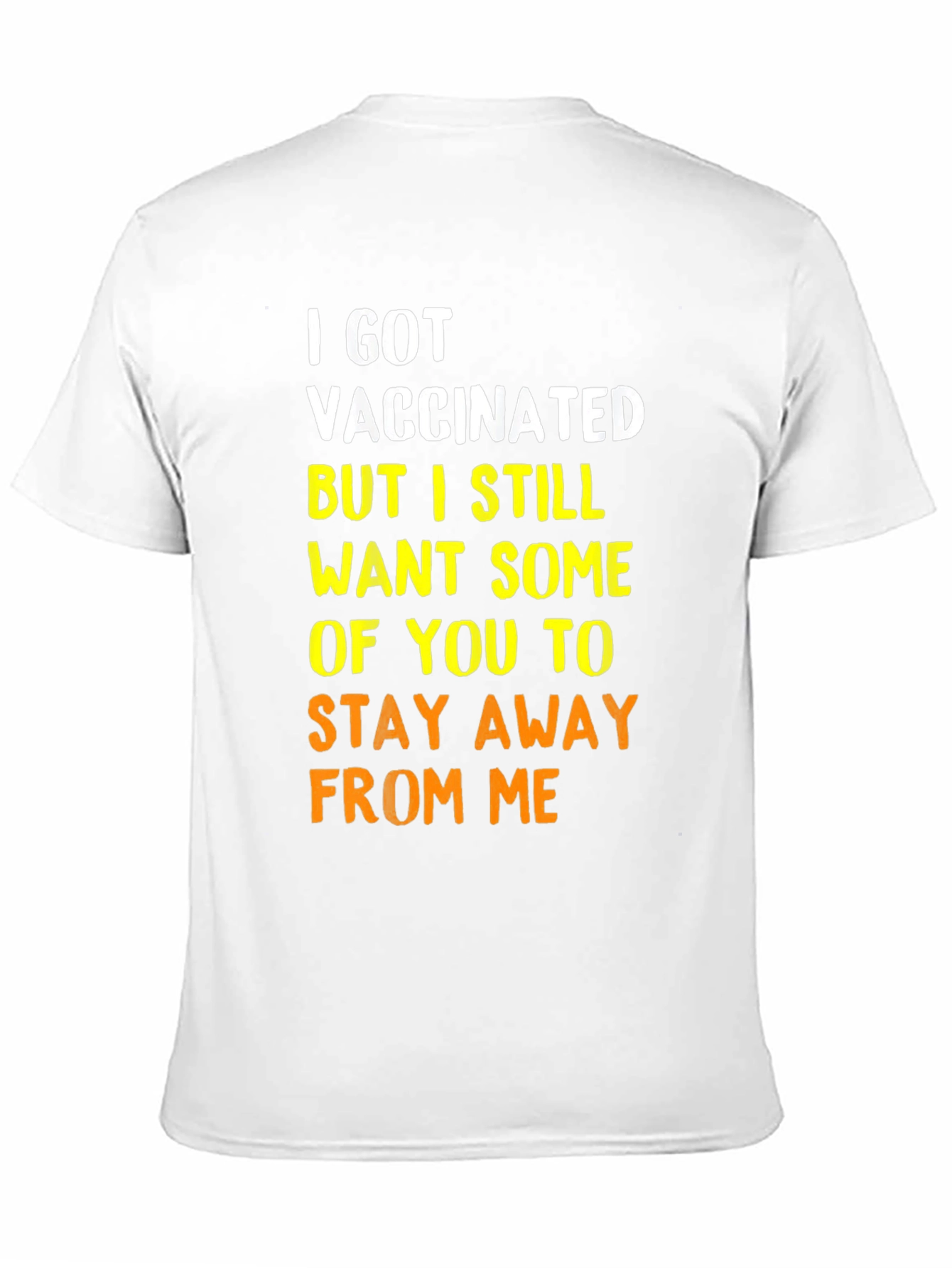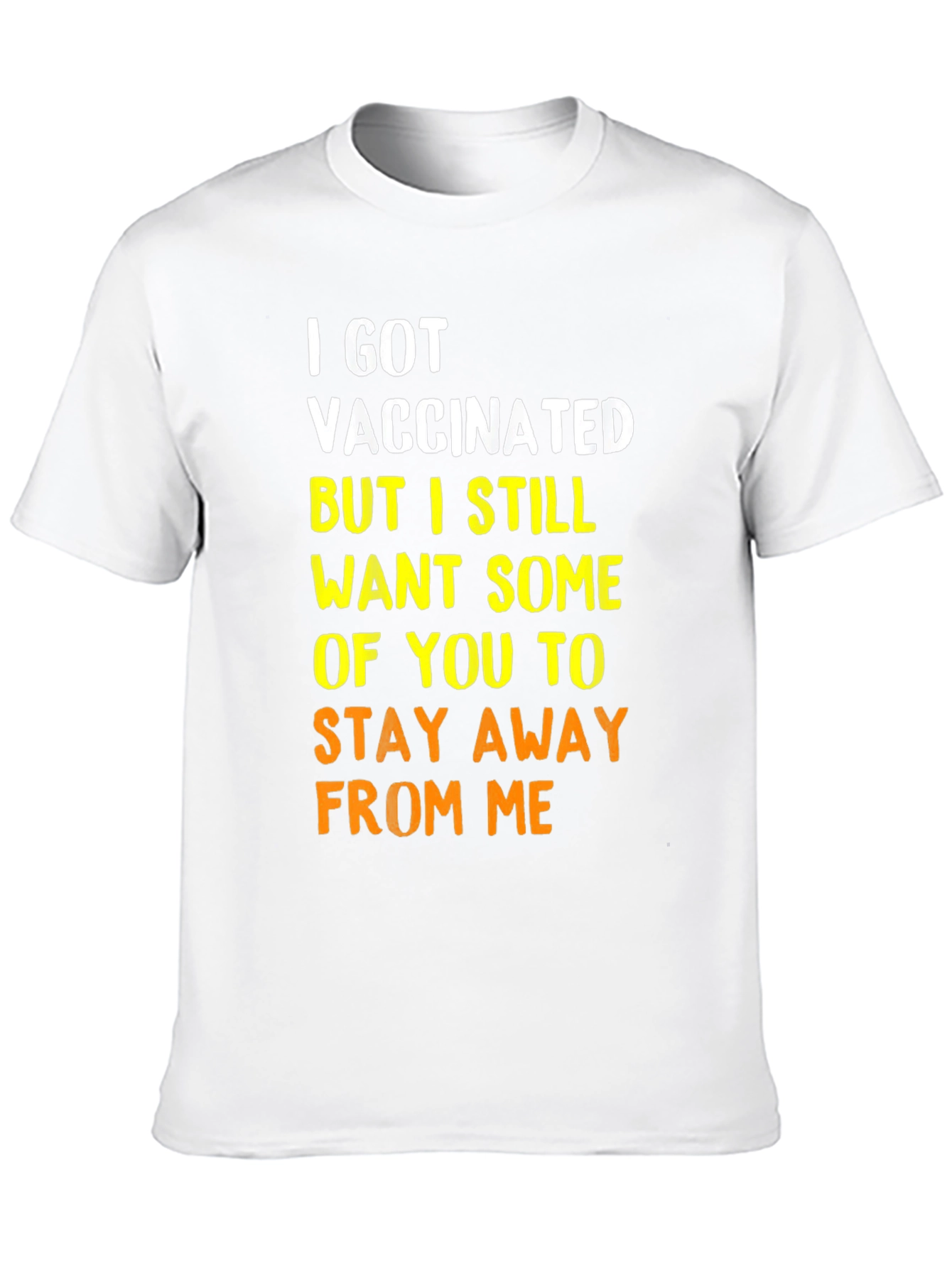 This black graphic t-shirt makes a statement with its bold lettering. The witty phrase "I GOT VACCINATED BUT I STILL WANT SOME OF YOU TO STAY AWAY FROM ME" is prominently displayed in white and yellow-orange text. The shirt has a classic crew neck and short sleeves. Made from a soft-looking cotton blend, it offers a comfortable fit for everyday wear. Perfect for expressing your personality, this tee is ideal for casual outings, social gatherings, or simply lounging at home. Show off your sense of humor and protect yourself with this stylish and funny t-shirt.