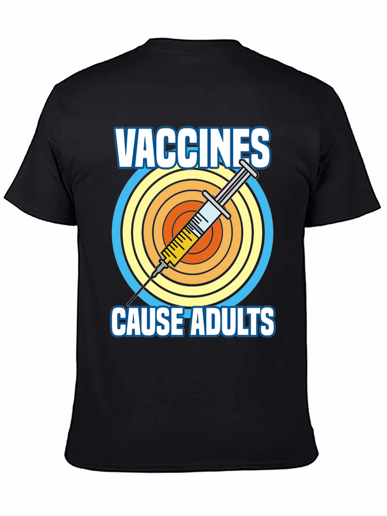 This black t-shirt features a bold and humorous graphic design. The design showcases the phrase "VACCINES CAUSE ADULTS" in a striking, outlined font. A colorful target-style circular design serves as a backdrop, with a detailed illustration of a syringe prominently displayed. The shirt appears to be made from a comfortable, soft fabric, ideal for casual wear. This tee is perfect for making a statement and sparking conversation. Wear it to social gatherings, casual outings, or simply as a fun addition to your everyday wardrobe. It combines comfort, style, and a touch of humor, making it a unique and eye-catching piece.