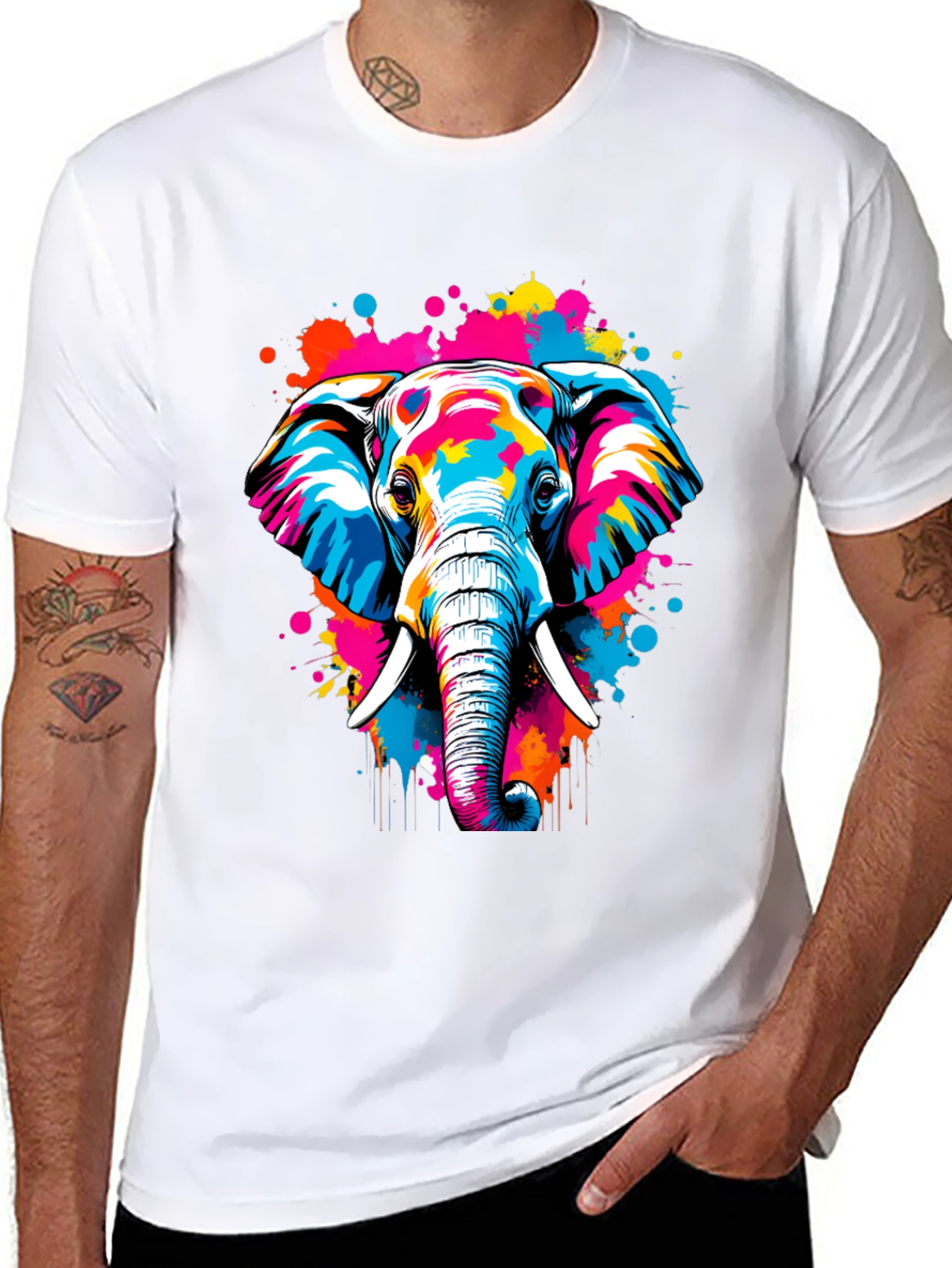 Make a statement with this eye-catching black t-shirt featuring a vibrant, colorful elephant graphic. The design showcases a stylized elephant head with a striking array of blues, pinks, oranges, and yellows, creating a playful yet artistic effect. The bright colors pop against the black background, ensuring you'll stand out in any crowd. Made from comfortable materials, this tee is perfect for casual wear, concerts, or expressing your unique style. It's a fun and fashionable addition to any wardrobe, ideal for animal lovers and art enthusiasts alike.