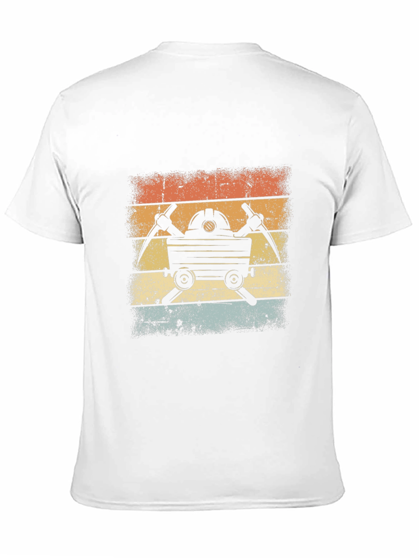 Show off your love for mining with this eye-catching t-shirt. This stylish black tee features a cool graphic of a miner's cart, helmet, and crossed pickaxes set against a retro-inspired orange, yellow, and blue distressed background. Made from a soft, comfortable fabric, this shirt is perfect for everyday wear. Whether you're a miner, a history buff, or just appreciate unique designs, this t-shirt is sure to become a favorite in your wardrobe. Its unique design makes it great for casual outings, themed parties, or simply relaxing at home.