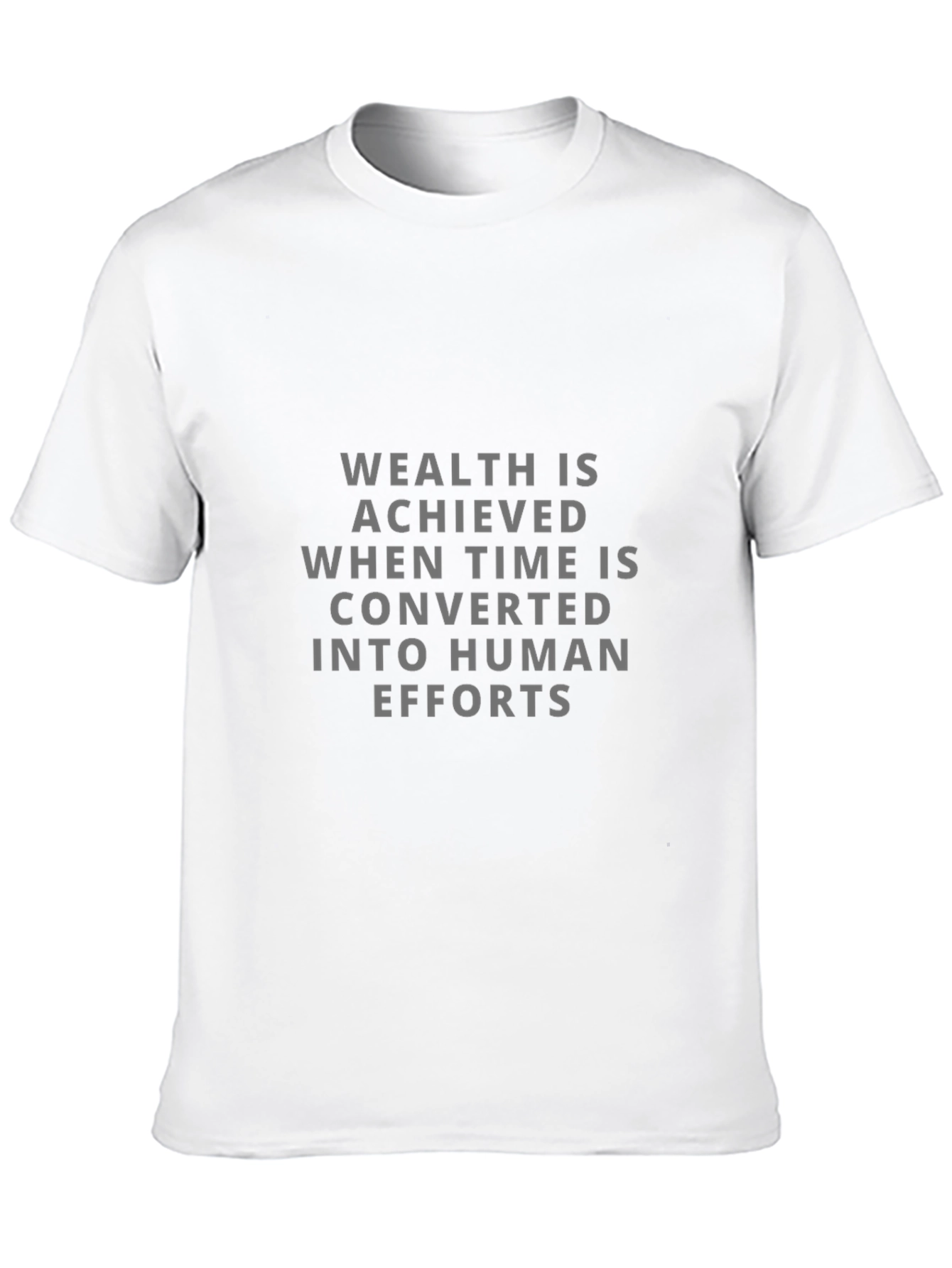 Elevate your everyday style with this statement t-shirt. Featuring the profound message "Wealth is Achieved When Time is Converted Into Human Efforts" emblazoned across the chest, this shirt is more than just apparel—it's a conversation starter. The classic black hue ensures versatility, making it a perfect match for jeans, shorts, or casual trousers. Crafted from a comfortable, breathable fabric, it's designed for all-day wear. Make a statement without saying a word with this inspiring and stylish tee, perfect for those who value time and effort.