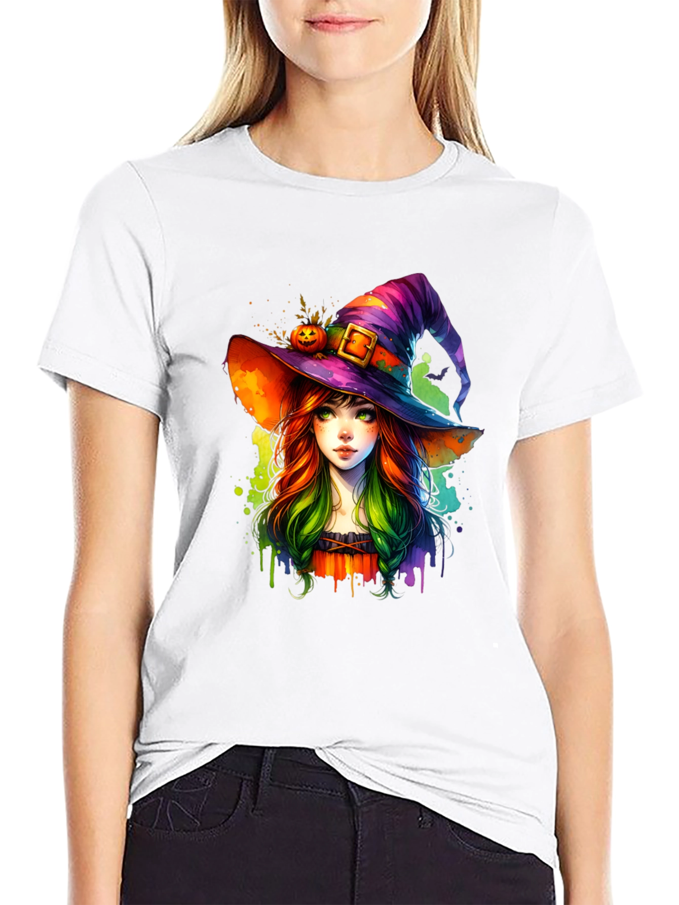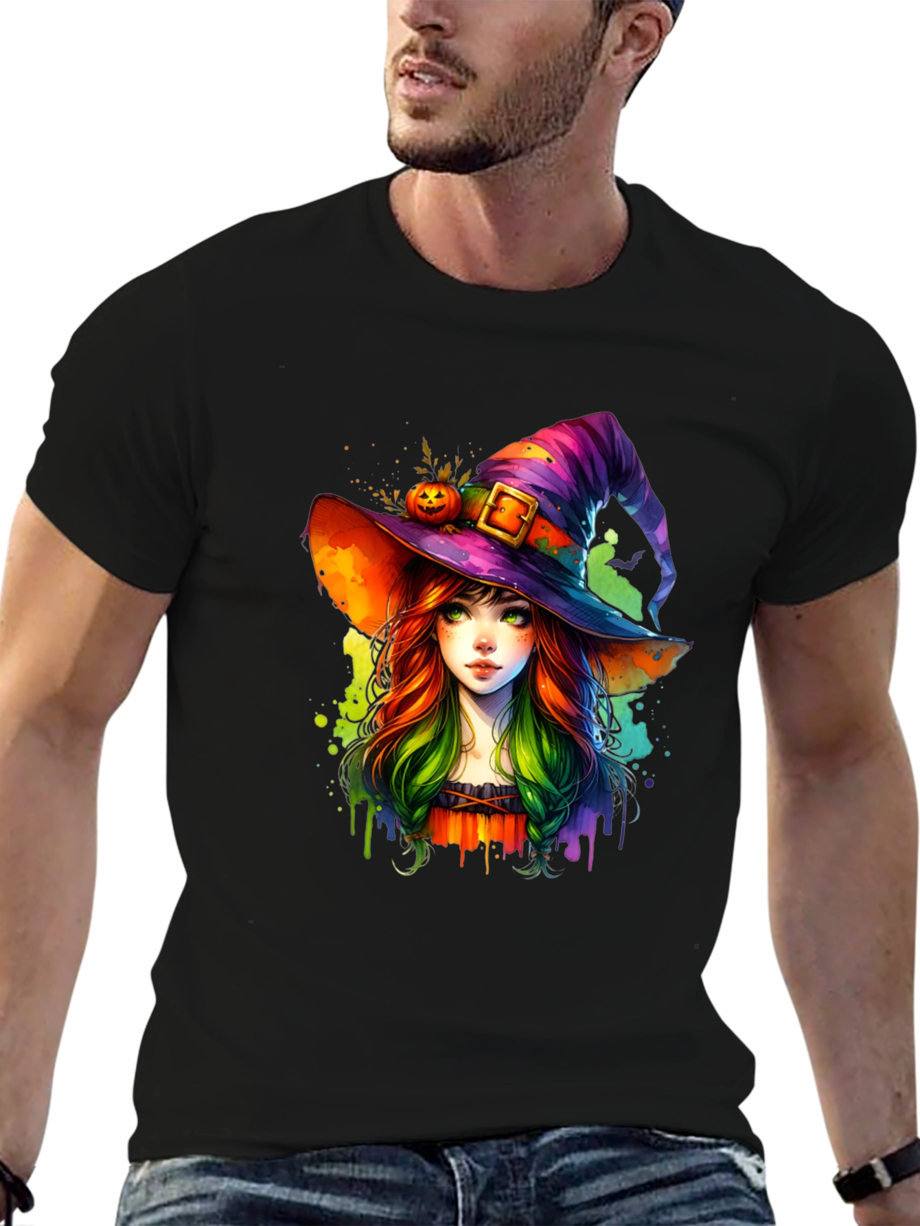 Embrace the spirit of Halloween with this unique graphic tee! This stylish black t-shirt features a vibrant, artistic rendering of a young witch wearing a colorful, striped hat adorned with a pumpkin. The design blends traditional Halloween elements with a modern watercolor aesthetic. The relaxed fit makes it perfect for casual wear. Wear it to Halloween parties, costume events, or just to show off your spooky side. This tee is sure to become a favorite in your Halloween wardrobe, offering both comfort and eye-catching style.