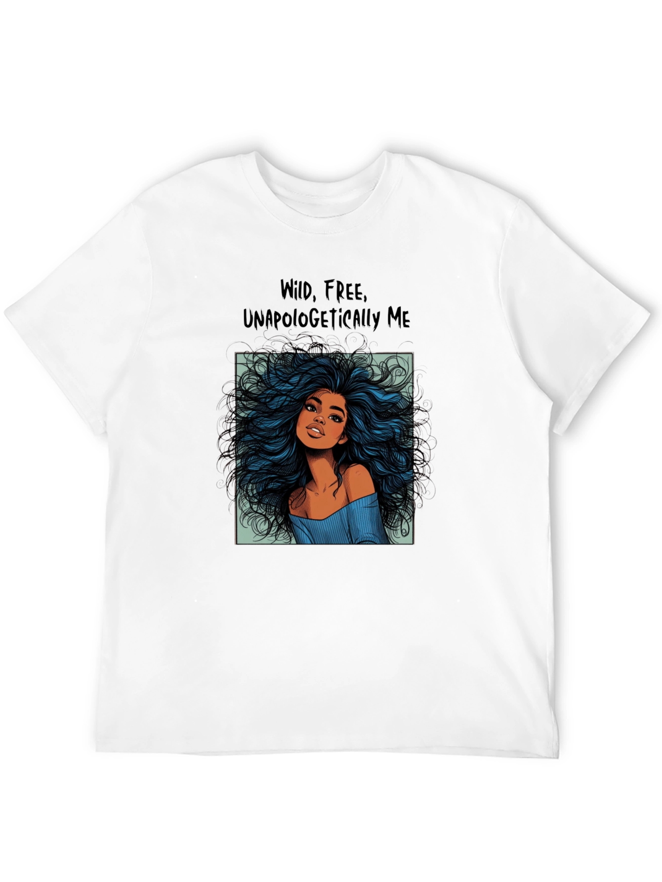 Show your free spirit with this bold black t-shirt! The tee features a stunning graphic of a woman with flowing blue hair, embodying confidence and individuality. Above the graphic are the words "Wild, Free, Unapologetically Me," perfectly capturing the essence of self-expression. Made from comfortable, breathable fabric, this shirt is perfect for everyday wear. Pair it with your favorite jeans or shorts for a casual yet stylish look. Let your inner wild child shine with this eye-catching tee!