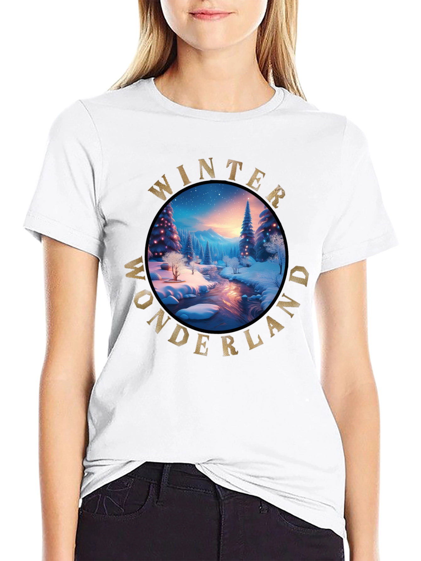 Embrace the winter season with this festive black t-shirt. The shirt features a circular graphic of a serene winter wonderland scene, complete with snow-covered trees, a flowing river, and a vibrant, colorful sky. The words "Winter Wonderland" are emblazoned around the image in a decorative, golden font, adding a touch of elegance and holiday charm. This tee is perfect for casual wear during the holiday season or as a unique gift for winter enthusiasts. The soft fabric ensures comfort, while the vibrant design adds a pop of seasonal cheer to any outfit. Pair it with jeans or leggings for a cozy, stylish look.