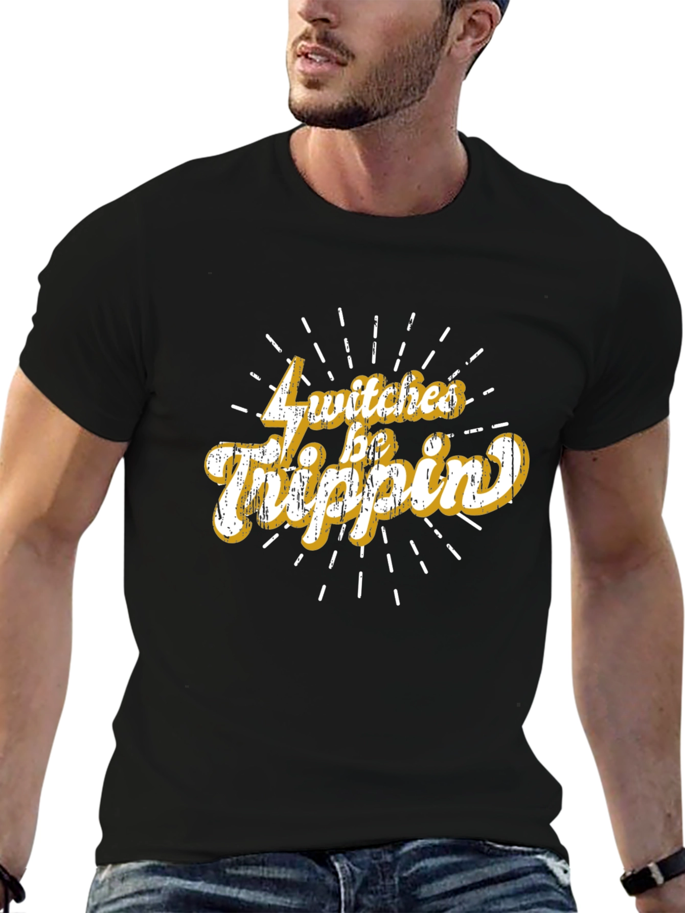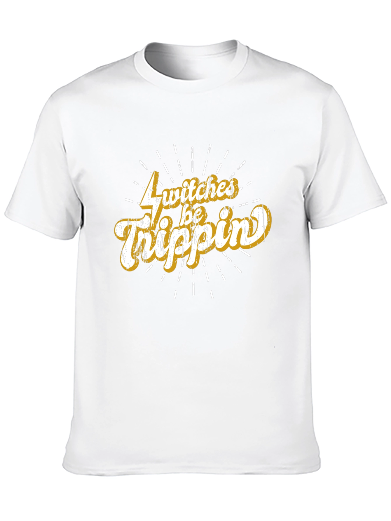 Show off your fun side with this black graphic t-shirt. The shirt features a novelty design of the phrase 'Witches Be Trippin' in a distressed, golden font, surrounded by starburst accents. The relaxed fit and soft fabric offer comfortable wear for casual outings, Halloween events, or lounging at home. Pair this unique tee with jeans or leggings for an effortless, stylish look that showcases your playful spirit. It’s a perfect addition to any wardrobe, providing a touch of humor and personality.