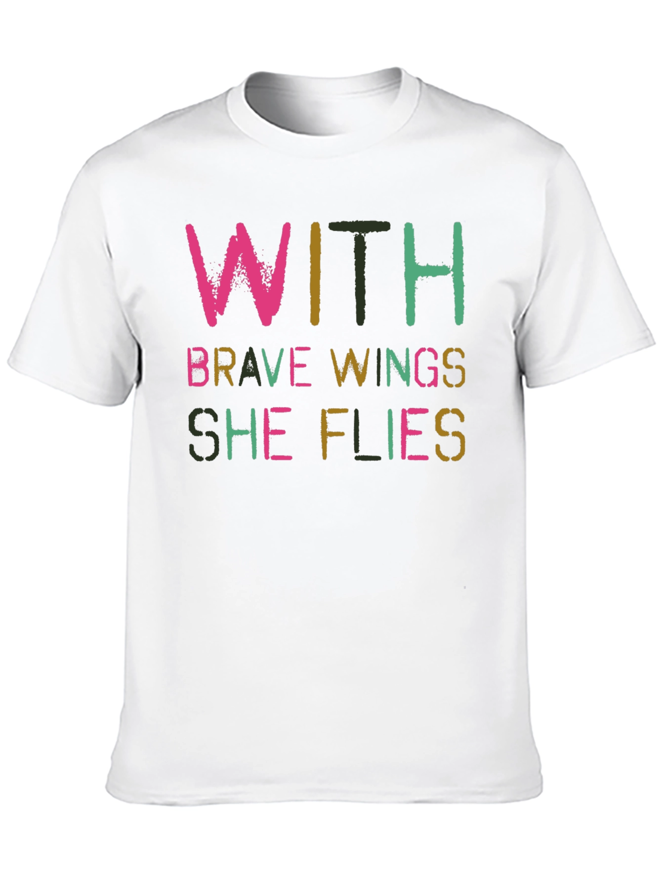 Show your spirit with this inspiring black graphic t-shirt! The bold design features the phrase "With Brave Wings She Flies" in a mix of eye-catching colors. This comfortable tee is made from soft, breathable fabric that drapes well on the body. The short sleeves and relaxed fit make it ideal for everyday wear, while the statement slogan adds a touch of empowerment to any outfit. Perfect for casual outings, expressing yourself, or as a thoughtful gift for a friend. Wear your strength and style with pride!