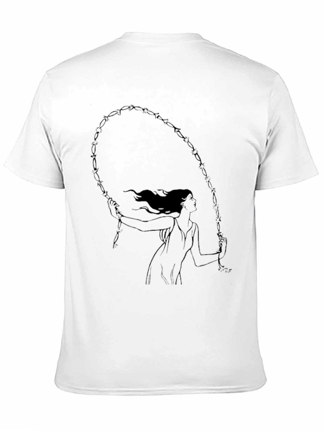This stylish black t-shirt features a unique graphic design. The detailed artwork depicts a woman encircled by barbed wire, creating a compelling and slightly edgy aesthetic. Made from what appears to be a comfortable and breathable fabric, this tee is perfect for everyday wear. The classic crew neck and short sleeves offer a relaxed fit that pairs well with jeans, shorts, or casual pants. Ideal for those who appreciate artistic expression and want to make a statement with their clothing. Stand out from the crowd with this eye-catching and conversation-starting piece.