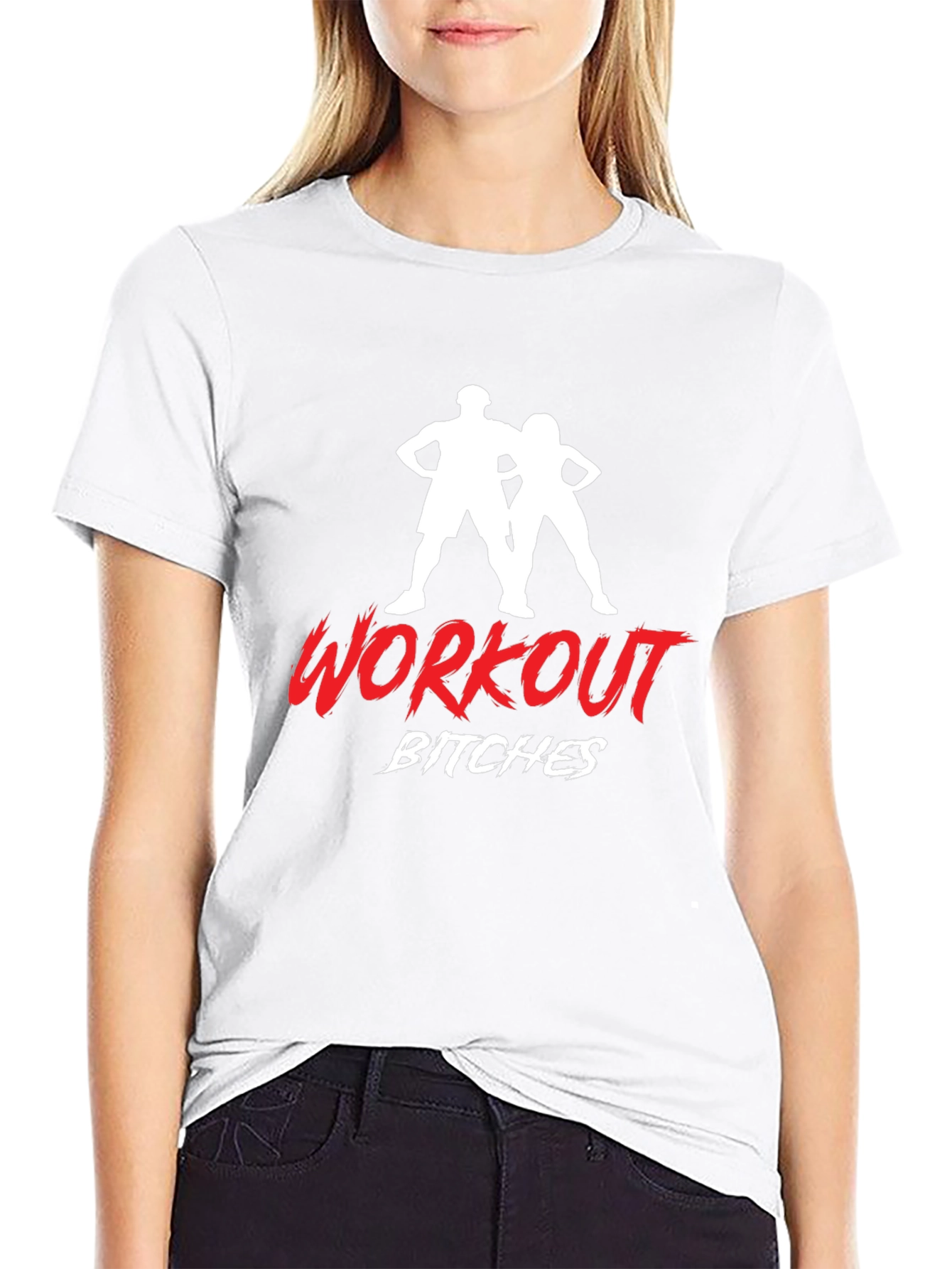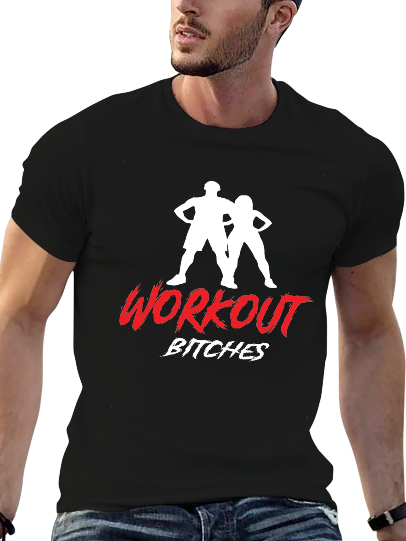 Get motivated with this edgy black t-shirt featuring a bold, white silhouette graphic of two fitness enthusiasts ready to workout. The phrase "WORKOUT BITCHES" is emblazoned in eye-catching red and white text. Perfect for gym sessions, casual outings, or making a statement, this tee combines comfort and attitude. The classic crew neck design ensures a relaxed fit, while the striking graphic adds a touch of humor and motivation to your wardrobe. Wear it to the gym to inspire yourself and others, or style it with your favorite jeans for an everyday look that pops.