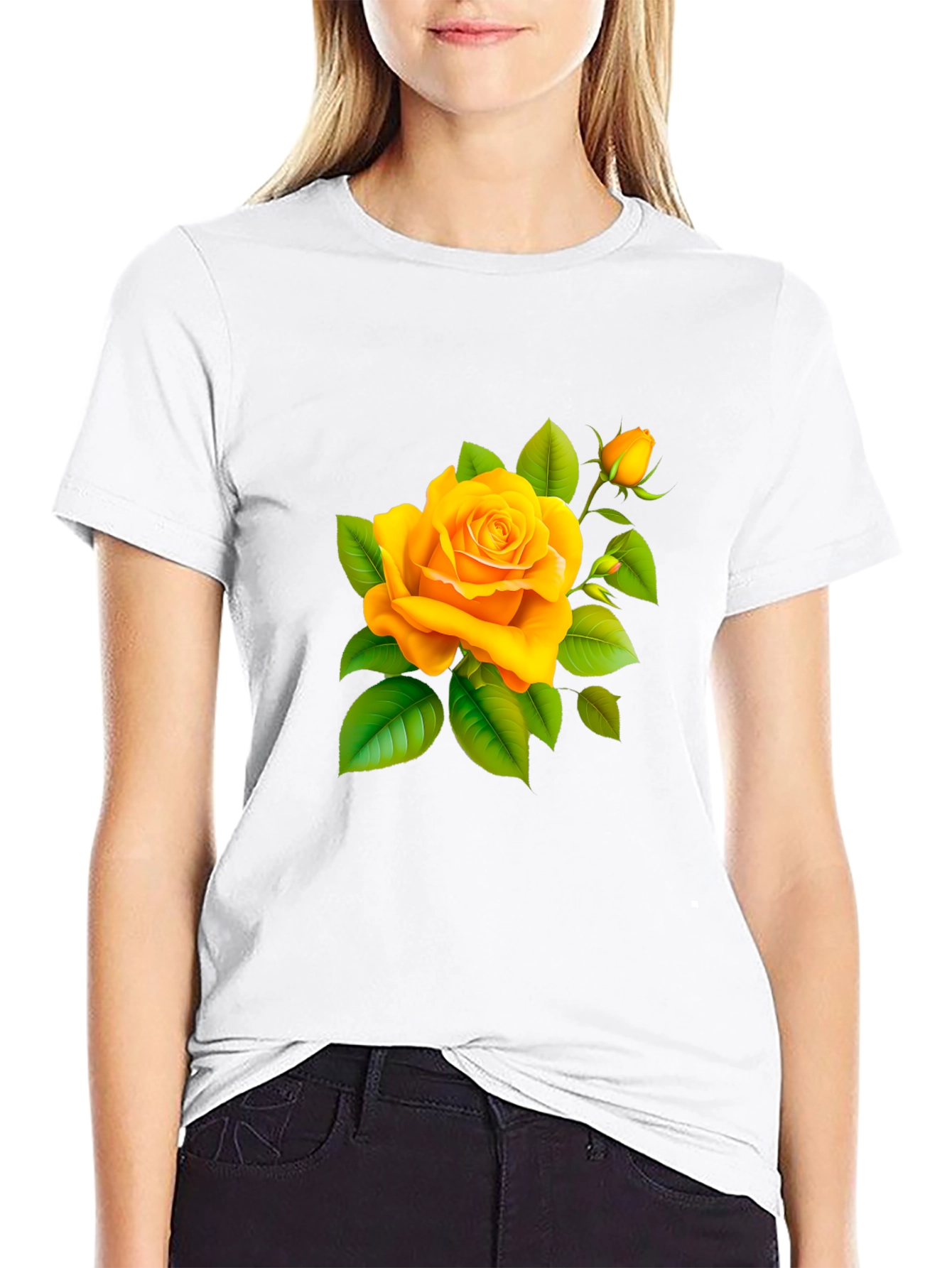 Elevate your everyday style with this striking black tee featuring a vibrant yellow rose graphic. Crafted from a soft and comfortable cotton blend, this shirt offers both style and breathability. The detailed rose design adds a touch of elegance and charm, making it a standout piece in any wardrobe. The classic crew neck and short sleeves provide a relaxed fit, perfect for casual outings, weekend adventures, or lounging at home. Pair it with jeans, shorts, or a skirt for a versatile and fashionable look. Add a touch of floral sophistication to your ensemble with this must-have graphic tee.