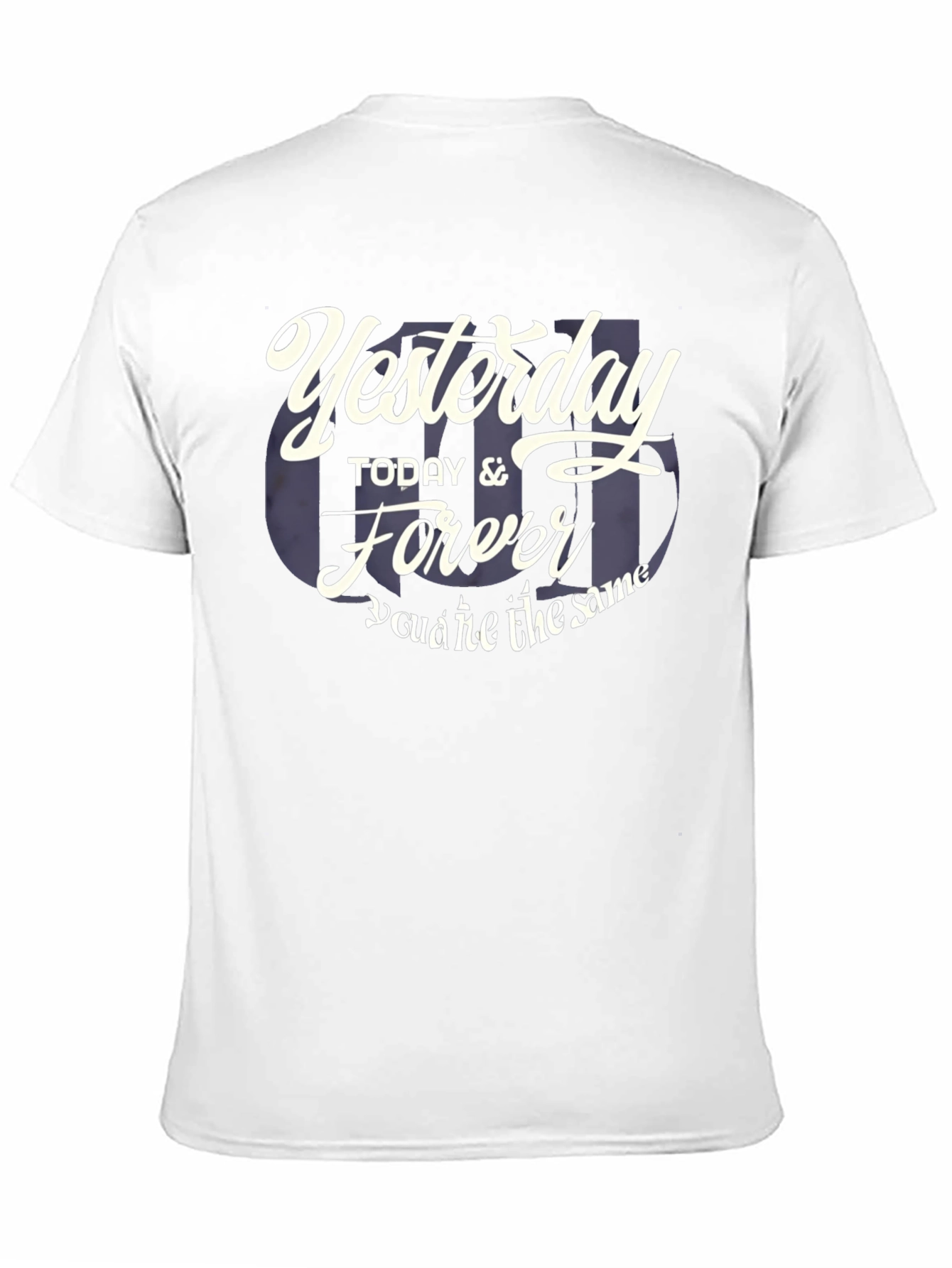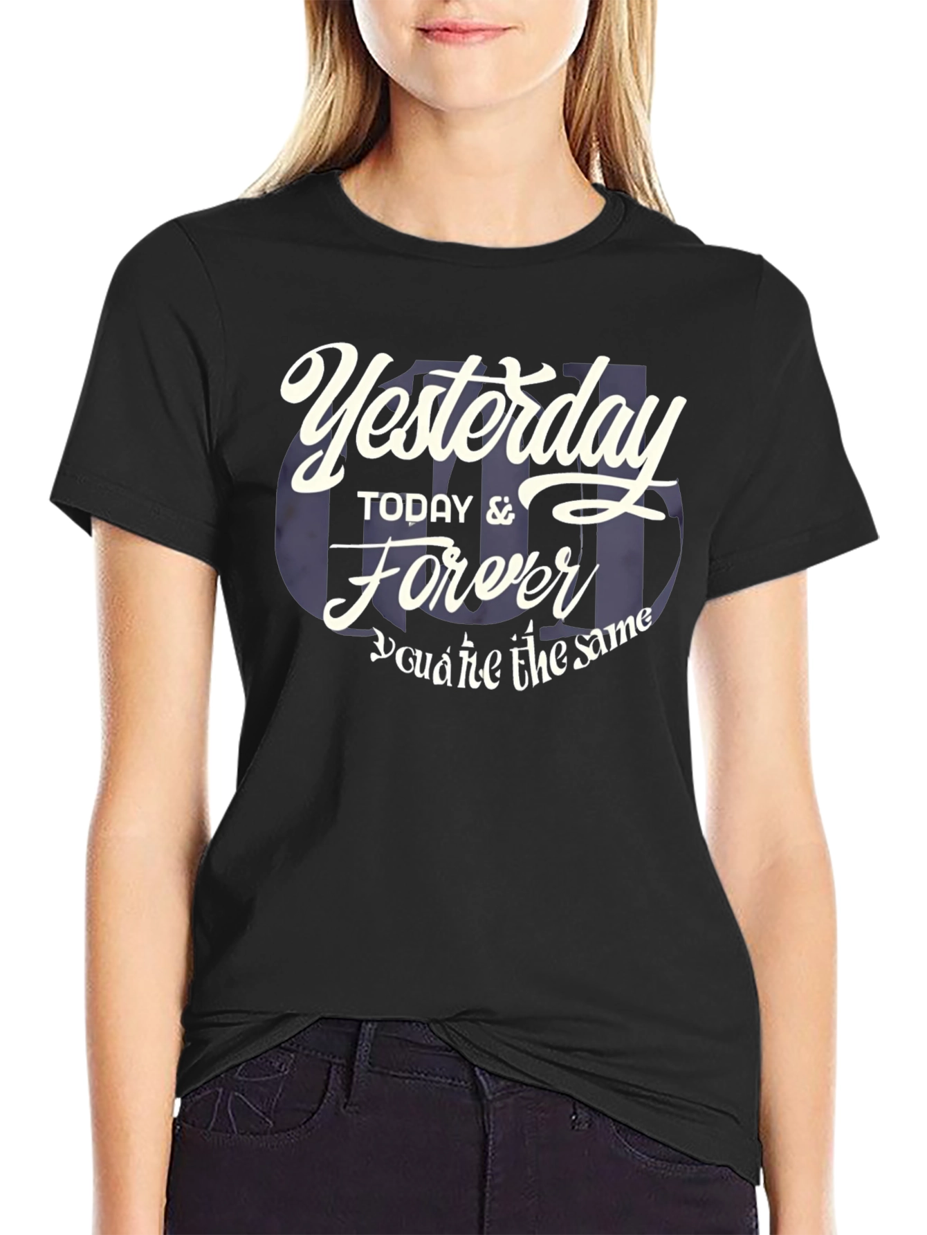 Embrace timeless style with this classic black t-shirt. Featuring a bold graphic design that reads 'Yesterday Today & Forever, You're the same', this tee offers a modern twist on a vintage-inspired look. The shirt appears to be made from a soft, breathable fabric, promising all-day comfort. Ideal for casual outings, concerts, or simply lounging at home, this versatile t-shirt pairs effortlessly with jeans, shorts, or your favorite streetwear. Make a statement with this expressive and unique piece.
