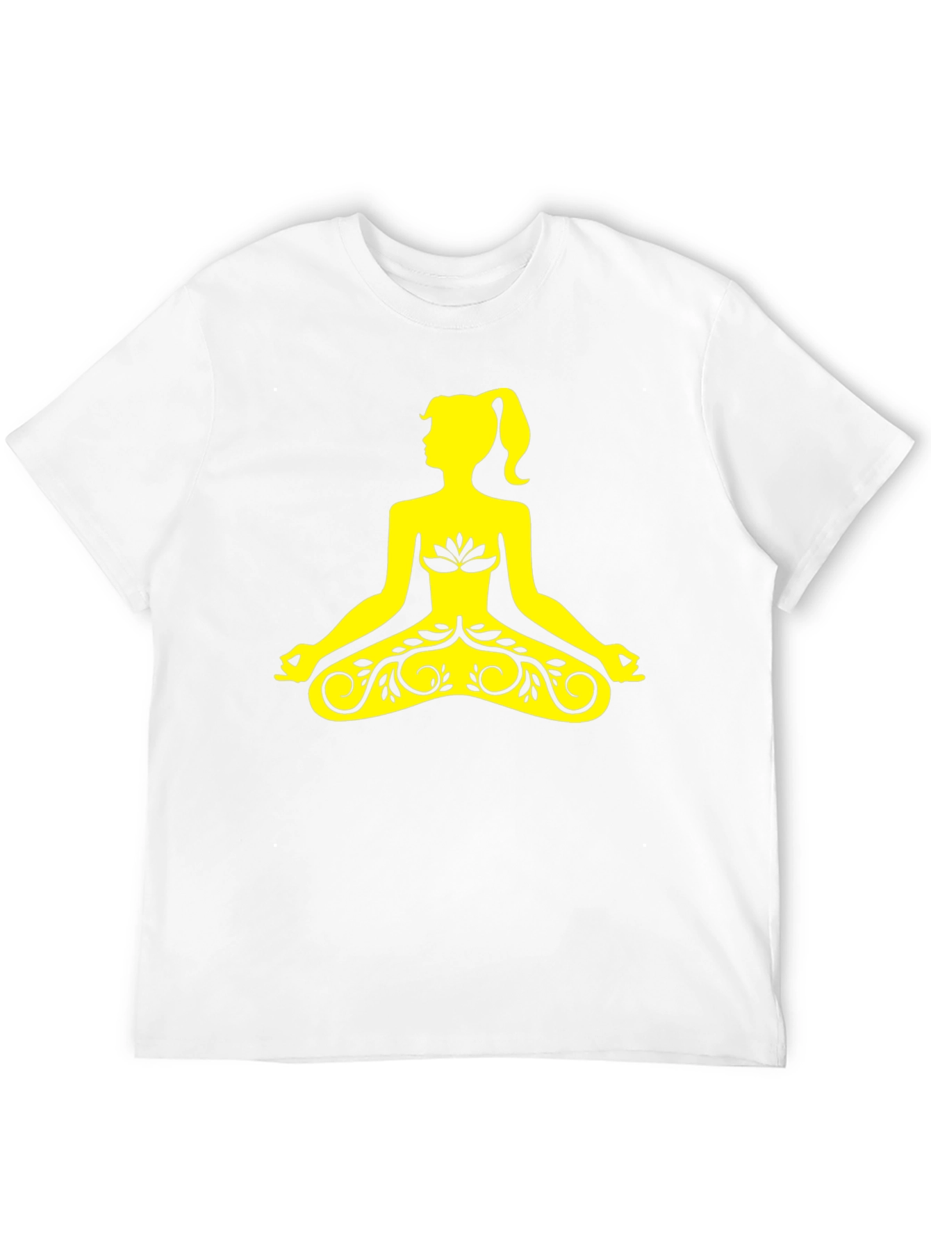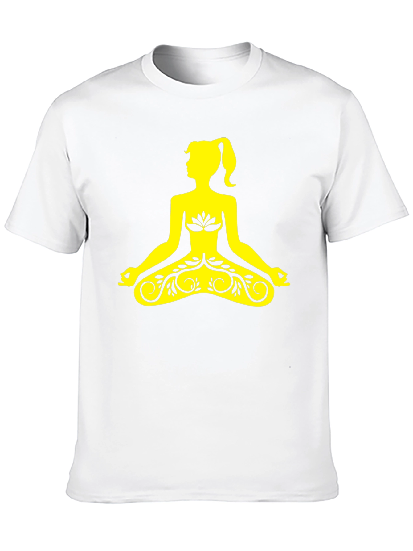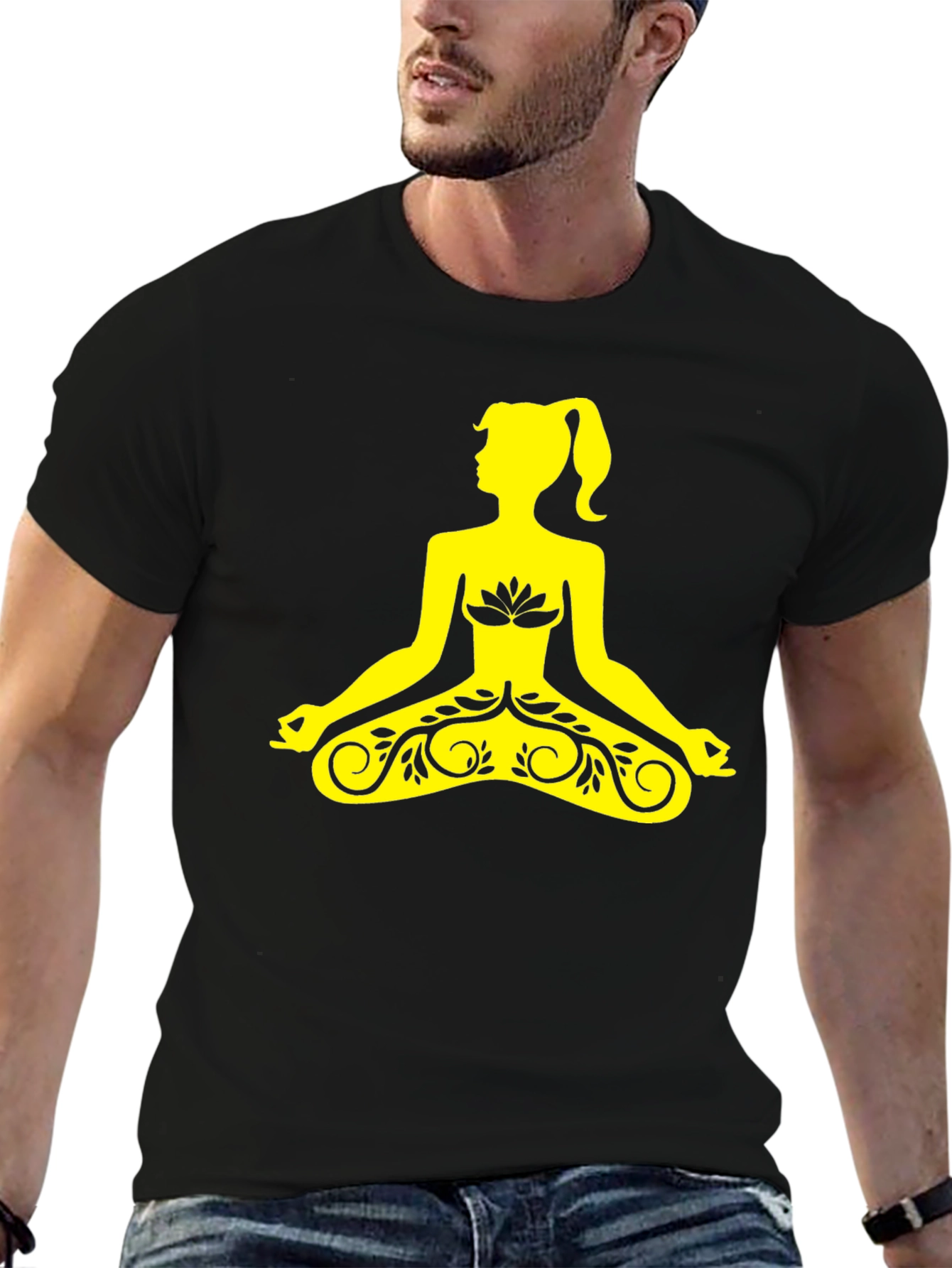 Elevate your style with this unique black t-shirt! Featuring a vibrant yellow design of a woman in a lotus yoga pose, this tee is perfect for yoga enthusiasts and anyone who appreciates stylish apparel. The intricate floral patterns add an elegant touch to the relaxed silhouette. Made from comfortable materials, this shirt is ideal for casual wear, workouts, or simply lounging in style. Show off your love for yoga and add a pop of color to your wardrobe with this eye-catching t-shirt!