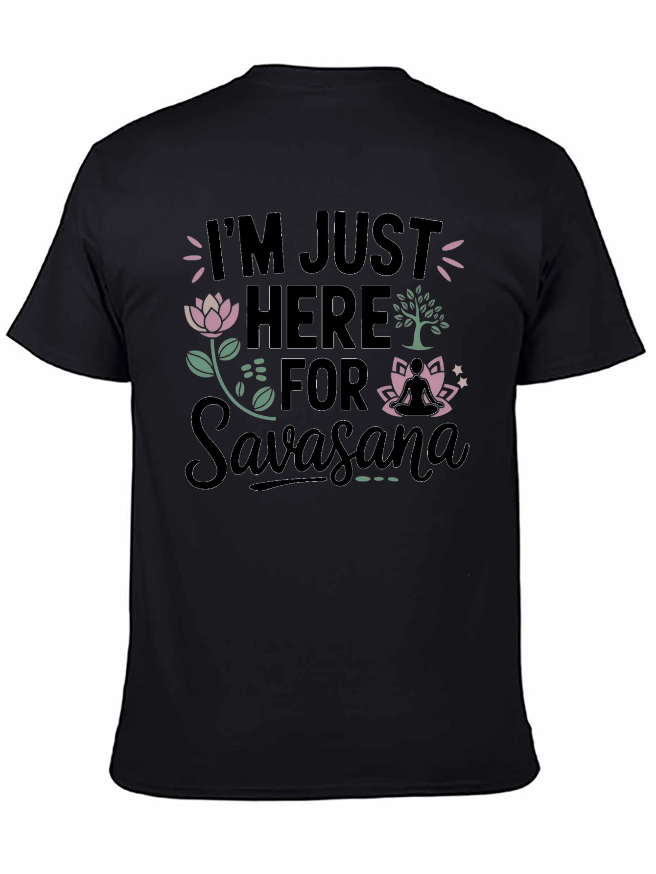 This black t-shirt features a unique design for yoga enthusiasts. The print showcases the phrase 'I'm Just Here For Savasana', surrounded by botanical elements including lotus flowers and a stylized tree. A silhouette of a person meditating adds a touch of zen. Made from soft, breathable fabric, this tee is perfect for yoga class, casual outings, or simply lounging at home. Show off your love for yoga and relaxation with this stylish and comfortable t-shirt.