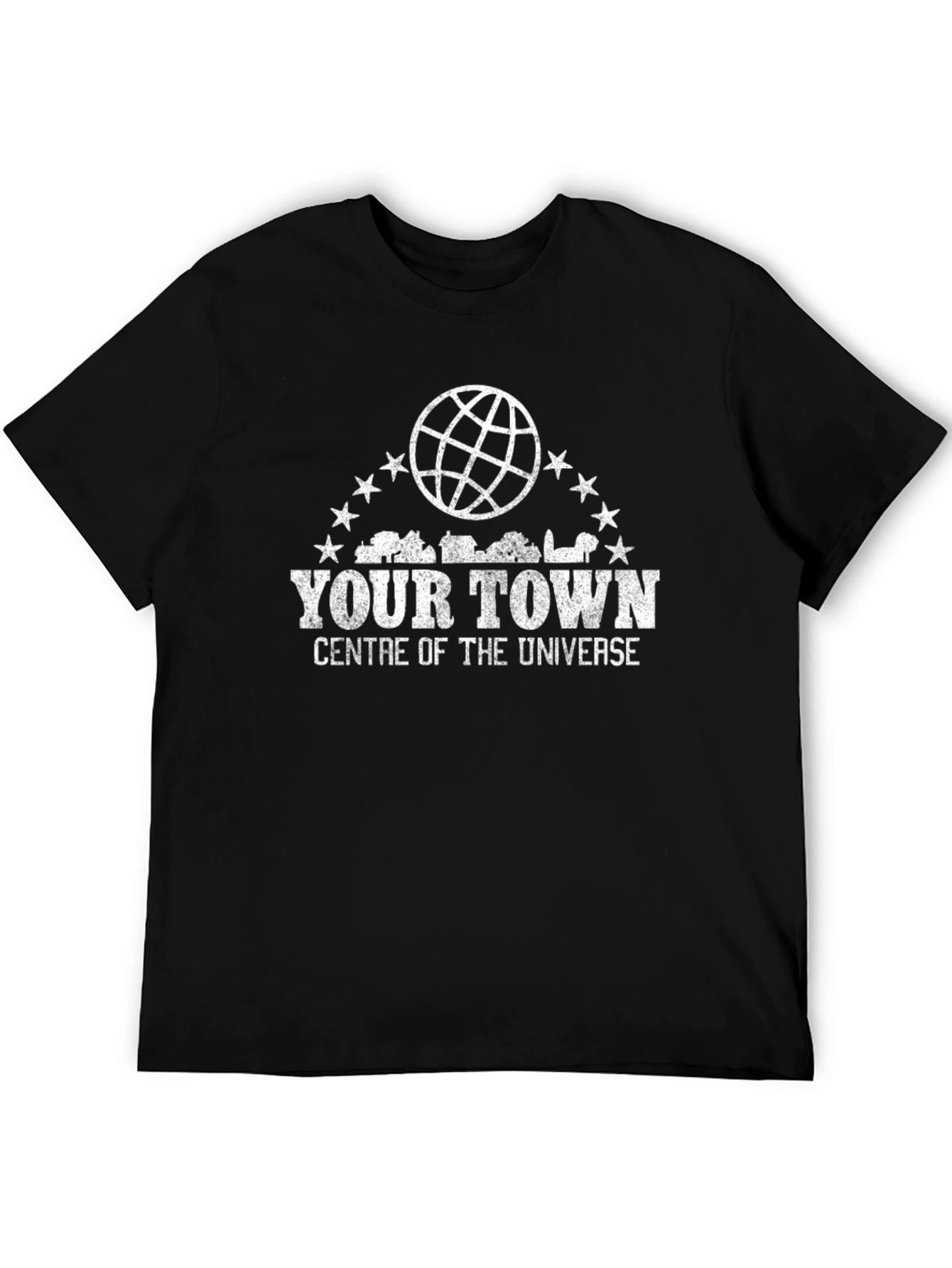 This classic black t-shirt features a unique and eye-catching design. The graphic includes a globe, stars, and building silhouettes above the text "YOUR TOWN" and "CENTRE OF THE UNIVERSE". The design has a distressed, vintage-inspired print, giving it a cool, worn-in look. Made from what appears to be a comfortable and breathable cotton blend, this tee is perfect for casual wear. Show off your town pride or give it as a fun gift. The black color ensures versatility, pairing easily with jeans, shorts, or joggers. This shirt is perfect for everyday wear, running errands, or hanging out with friends. A must-have for anyone with a sense of humor and local spirit!