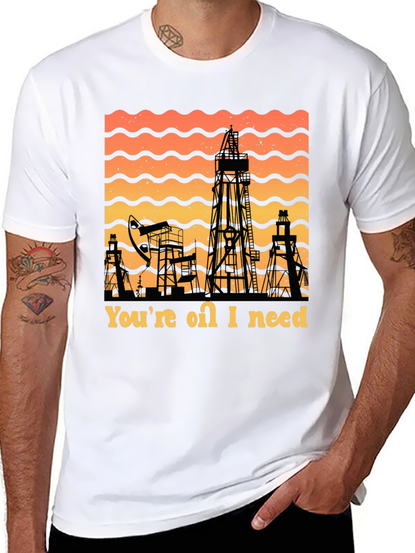 Show your love for oil with this striking black t-shirt. It features a bold graphic design showcasing oil rigs against a retro sunset backdrop of orange waves. The playful phrase 'You're oil I need' adds a touch of humor. Made from comfortable, breathable fabric, this tee is perfect for casual wear, industry events, or showing off your passion. Makes a great gift for oilfield workers, geologists, or anyone who appreciates the energy industry. Get yours today and wear your enthusiasm with pride!
