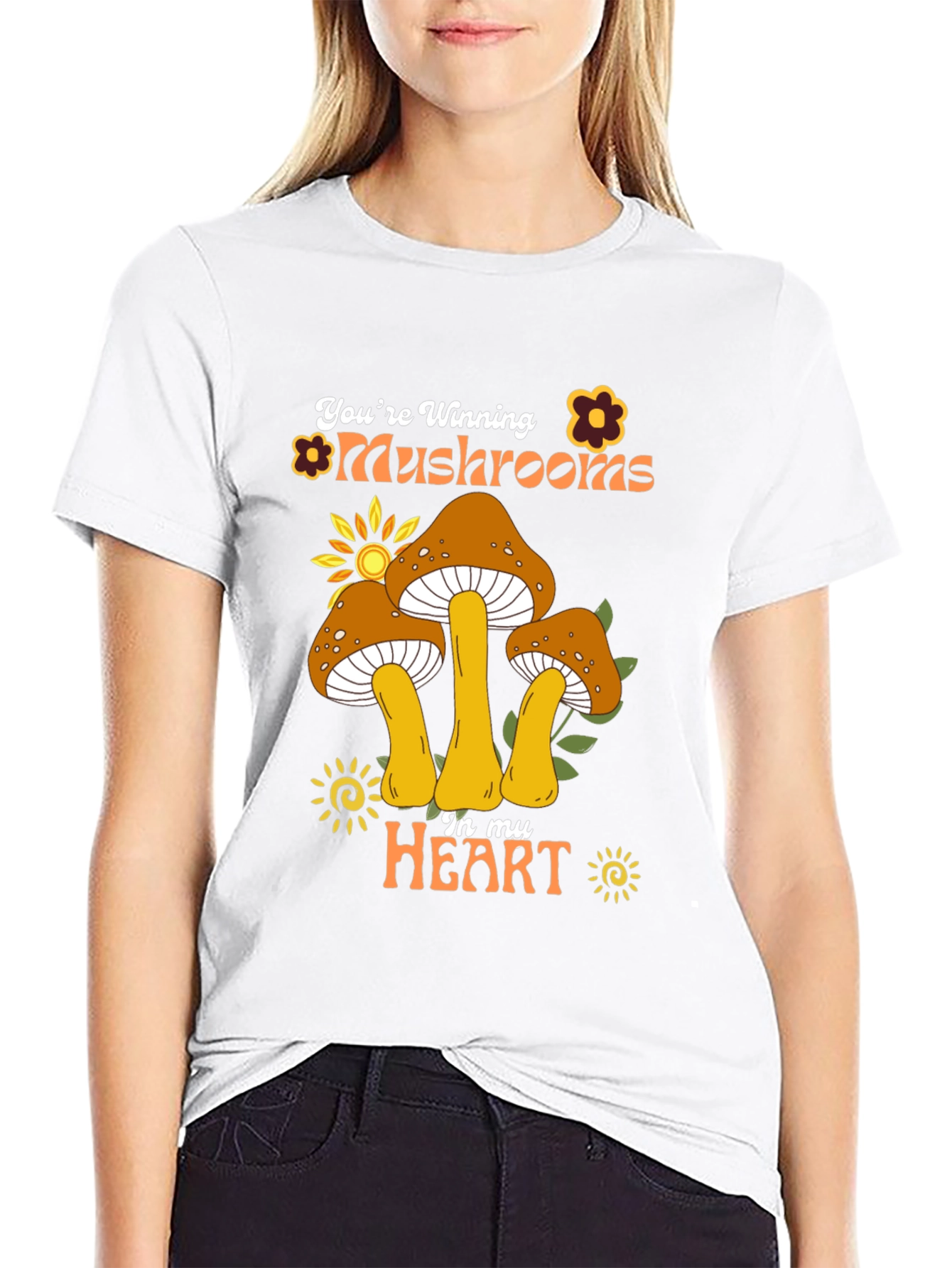 Spread the love for mushrooms with this stylish black t-shirt. This tee features a retro-inspired design with groovy text 'You're Winning Mushrooms In My Heart', accompanied by whimsical mushroom illustrations and floral accents. The design is perfect for nature enthusiasts, foodies, or anyone with a playful sense of style. Wear it casually with jeans or dress it up with a blazer for a unique and eye-catching look. Made from comfortable materials, this shirt is great for everyday wear.